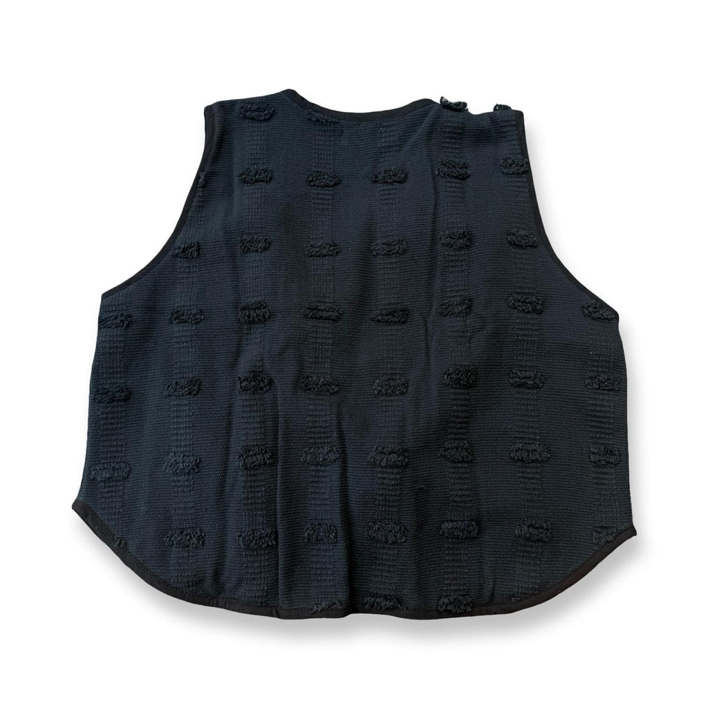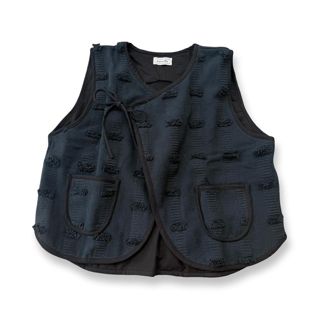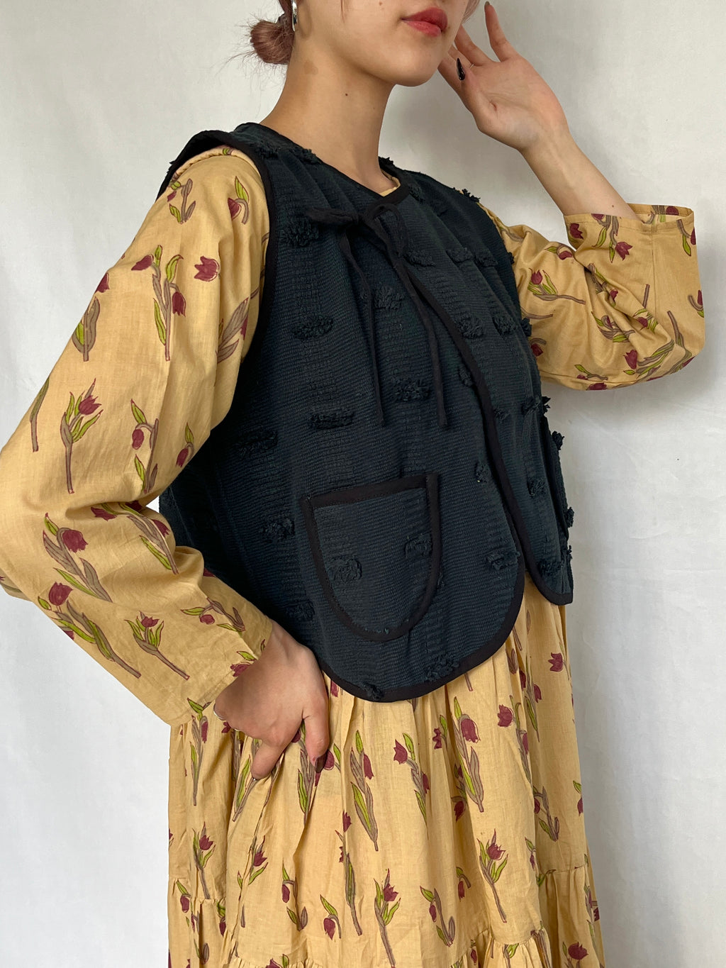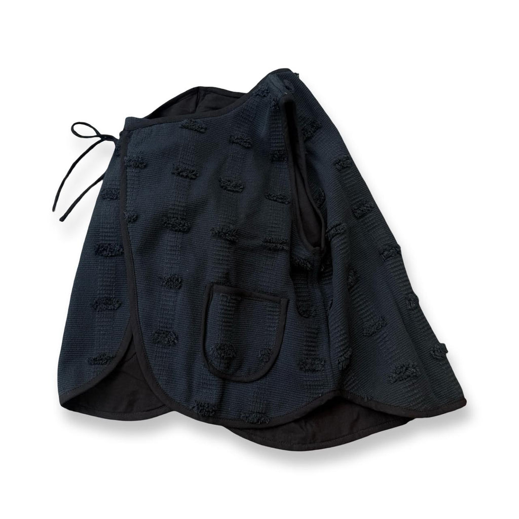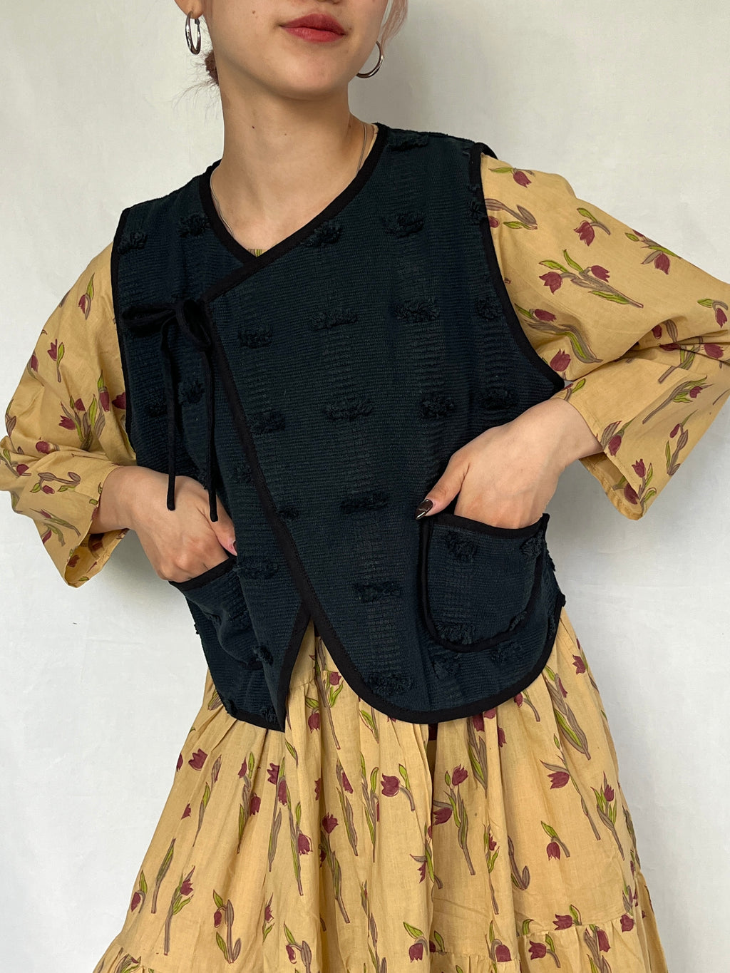 ブラックとからし色の、ベストのようなノースリーブジャケット。前面のカシュクールのような開きが特徴的。ポケットも付いていますよ。模様が浮き出るように織られているのも、可愛いポイント。RICCI EVERYDAYのお洋服にも合わせたい、可愛いベストです。