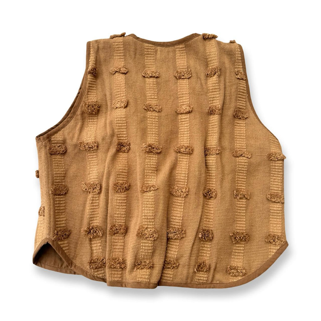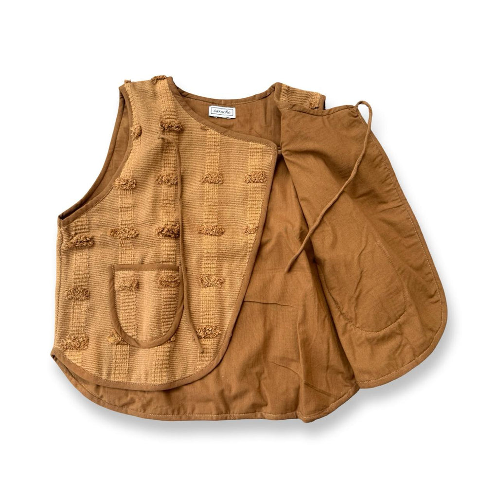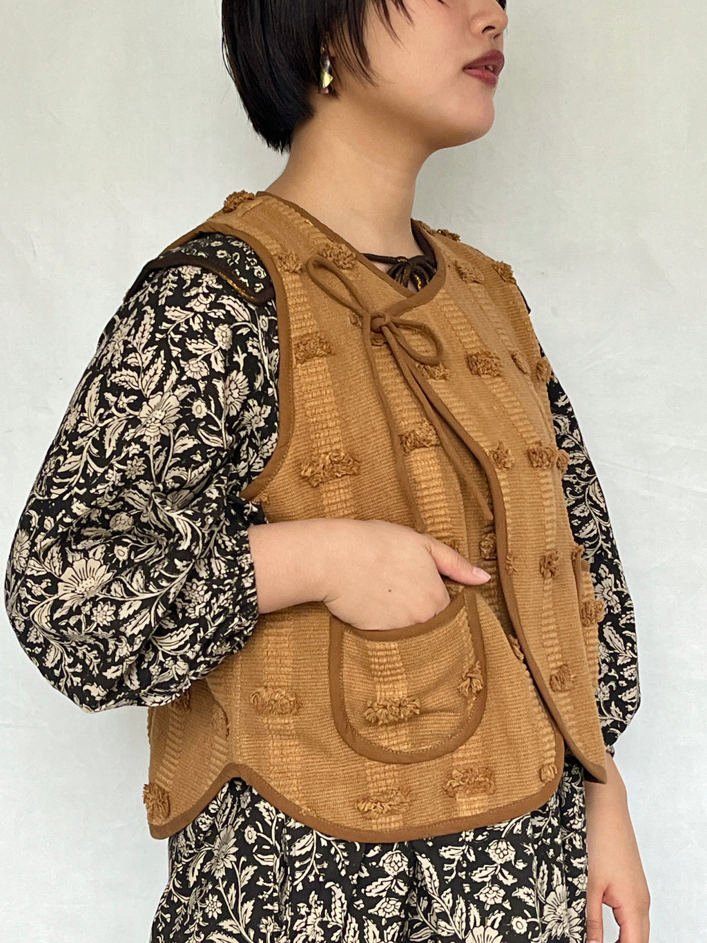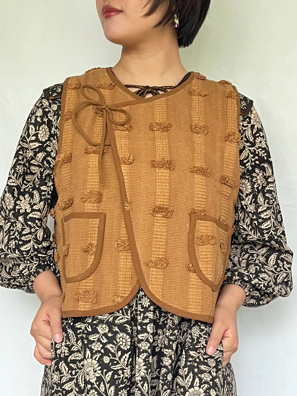 ブラックとからし色の、ベストのようなノースリーブジャケット。前面のカシュクールのような開きが特徴的。ポケットも付いていますよ。模様が浮き出るように織られているのも、可愛いポイント。RICCI EVERYDAYのお洋服にも合わせたい、可愛いベストです。