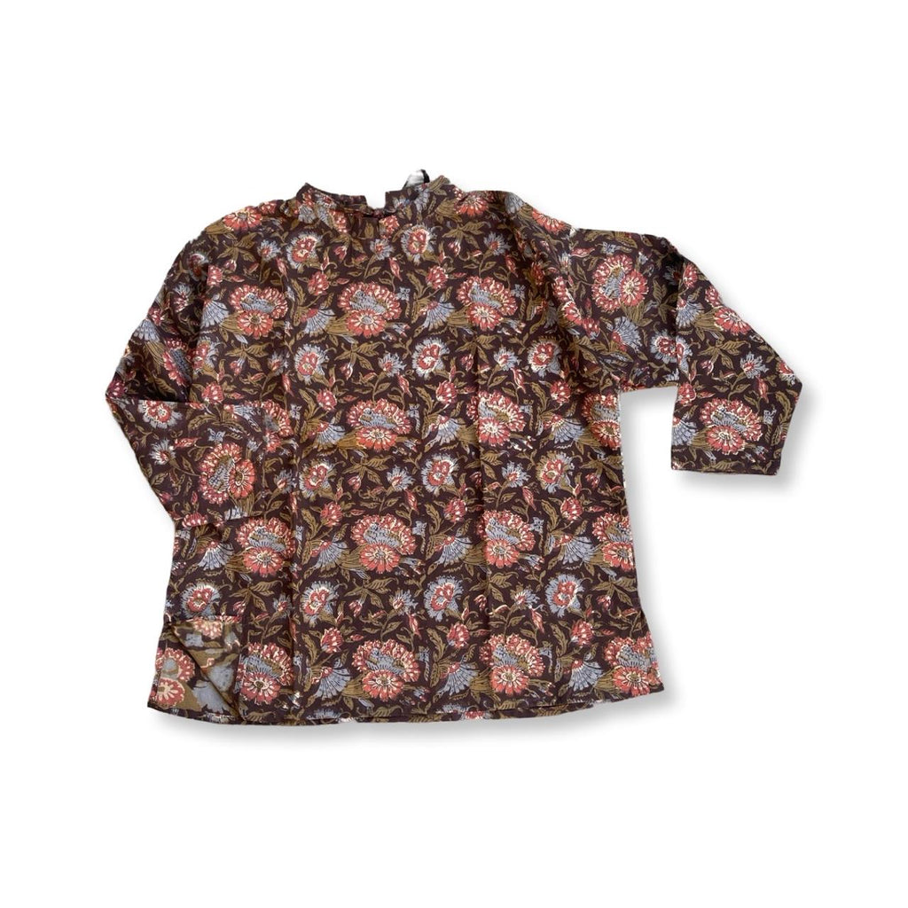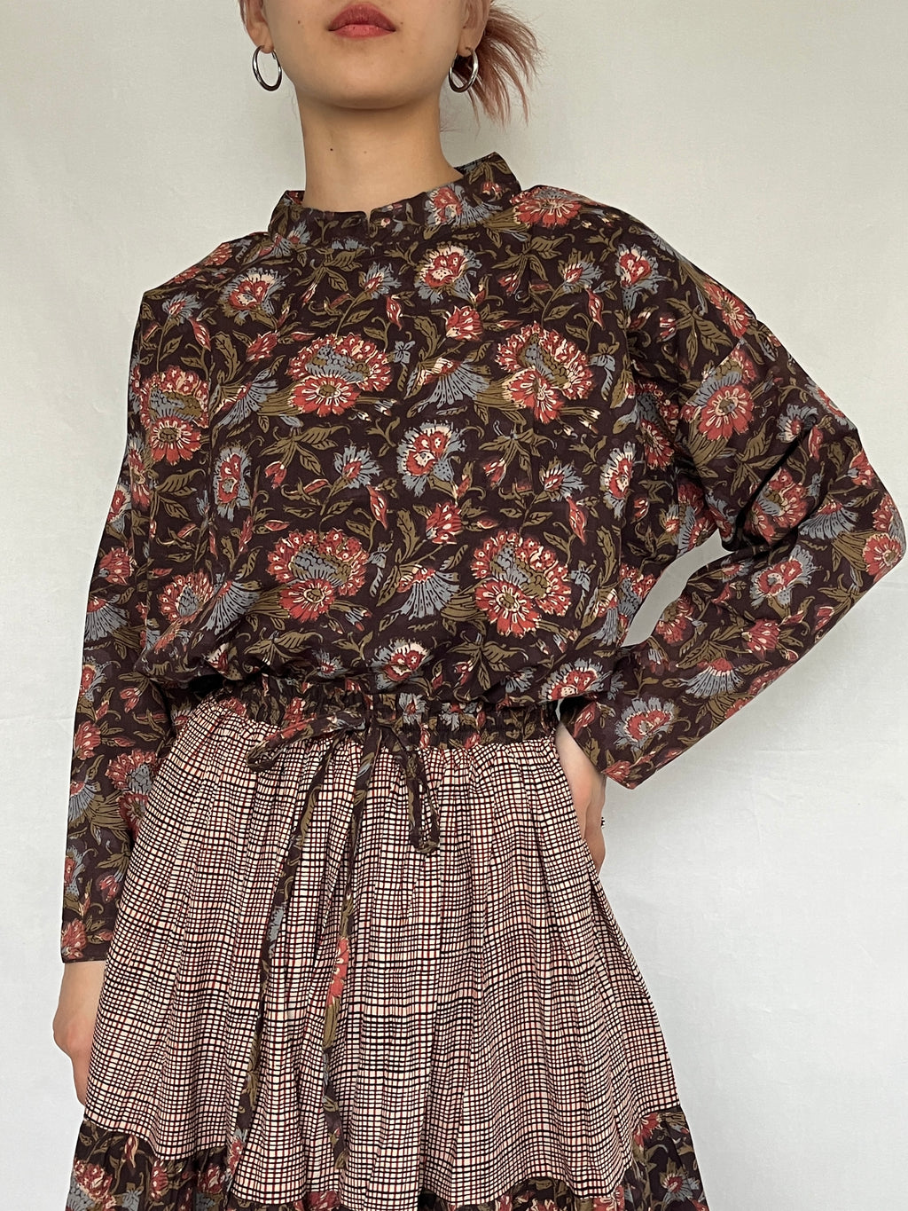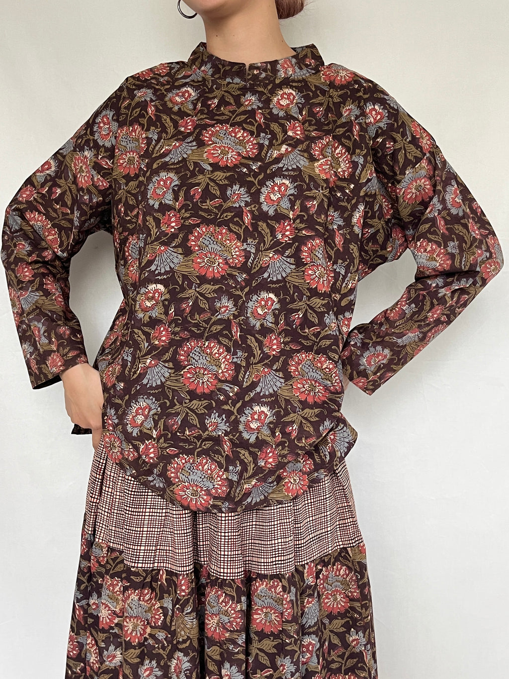 エレガントさをまとったブラウス。シックな色味が、日本の季節にもマッチし、秋の紅葉の季節のお出かけに着ていきたい一品。同柄のティアードスカートとのセットアップもおすすめです。