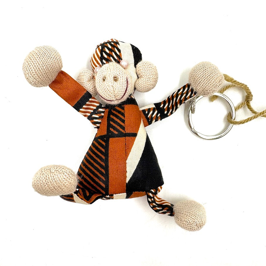 そのチンパンジーをモチーフに、普通だったら捨てられてしまうハギレなどを活用して、キーホルダーにしました。ユニークな色使いに元気をもらえます。