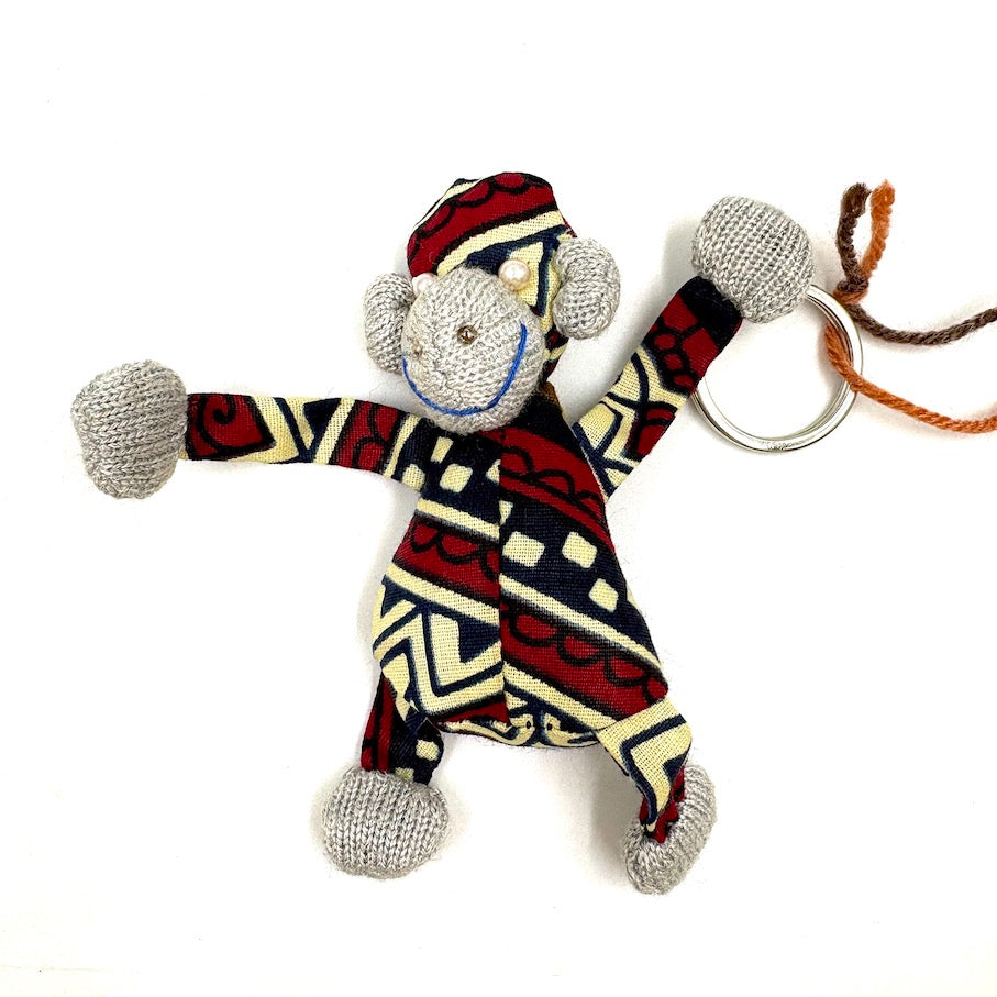 そのチンパンジーをモチーフに、普通だったら捨てられてしまうハギレなどを活用して、キーホルダーにしました。ユニークな色使いに元気をもらえます。