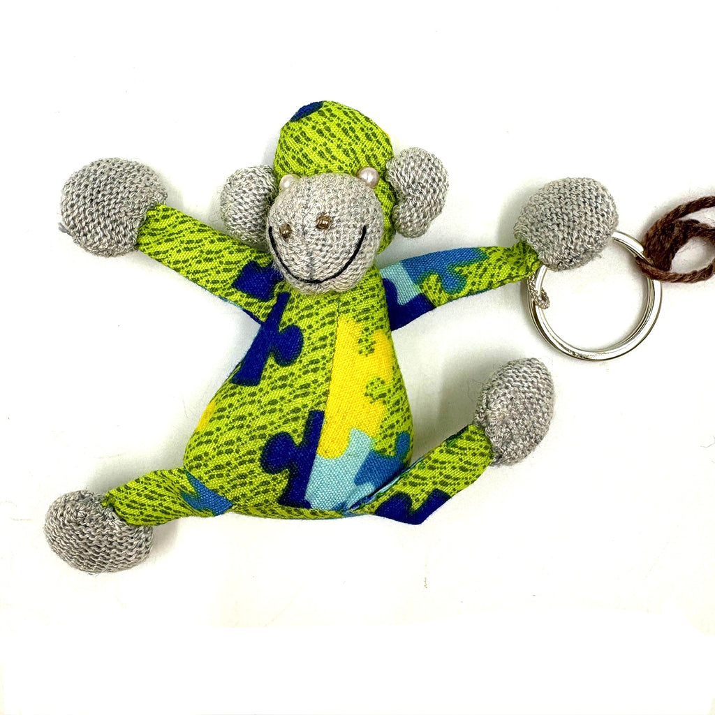 そのチンパンジーをモチーフに、普通だったら捨てられてしまうハギレなどを活用して、キーホルダーにしました。ユニークな色使いに元気をもらえます。