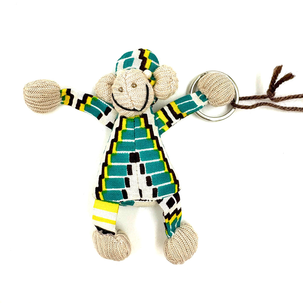 そのチンパンジーをモチーフに、普通だったら捨てられてしまうハギレなどを活用して、キーホルダーにしました。ユニークな色使いに元気をもらえます。