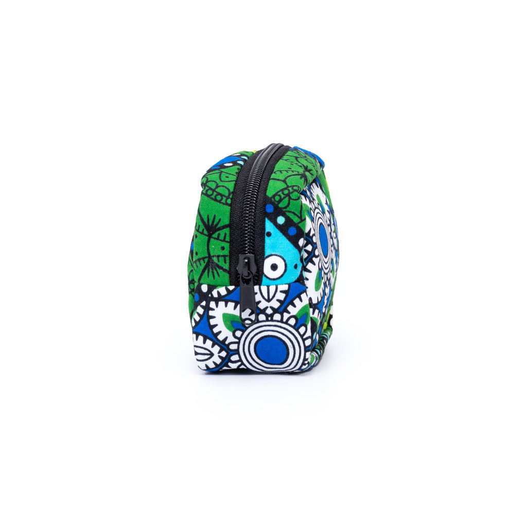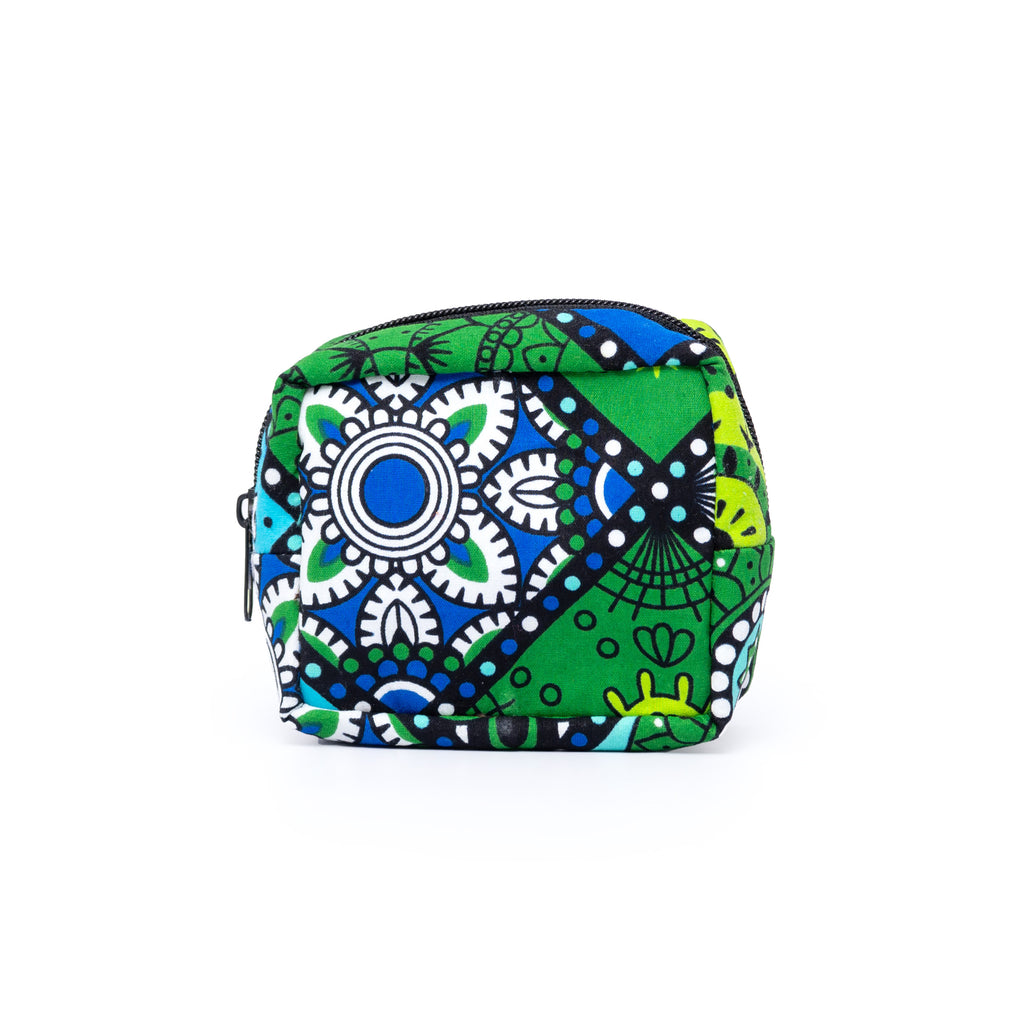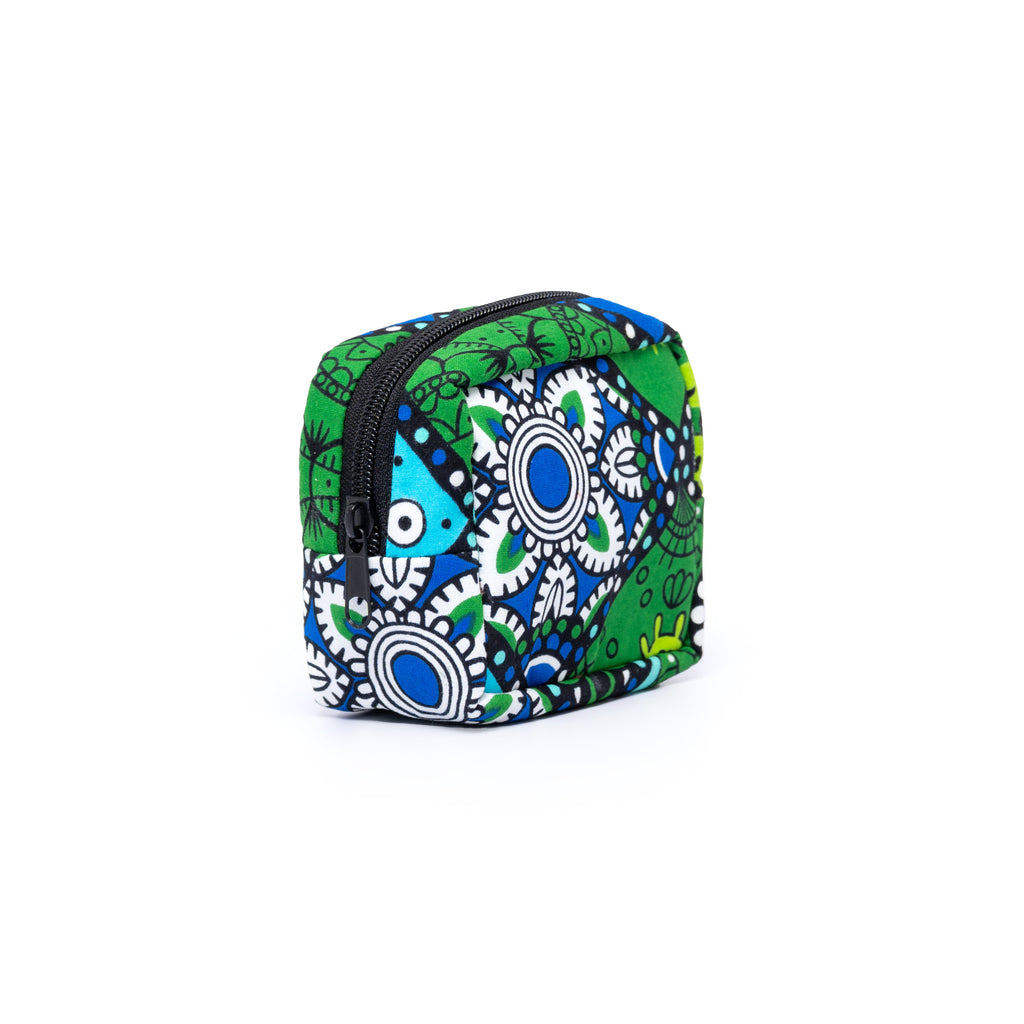 アフリカンプリントを使用した、キューブ型ポーチ。