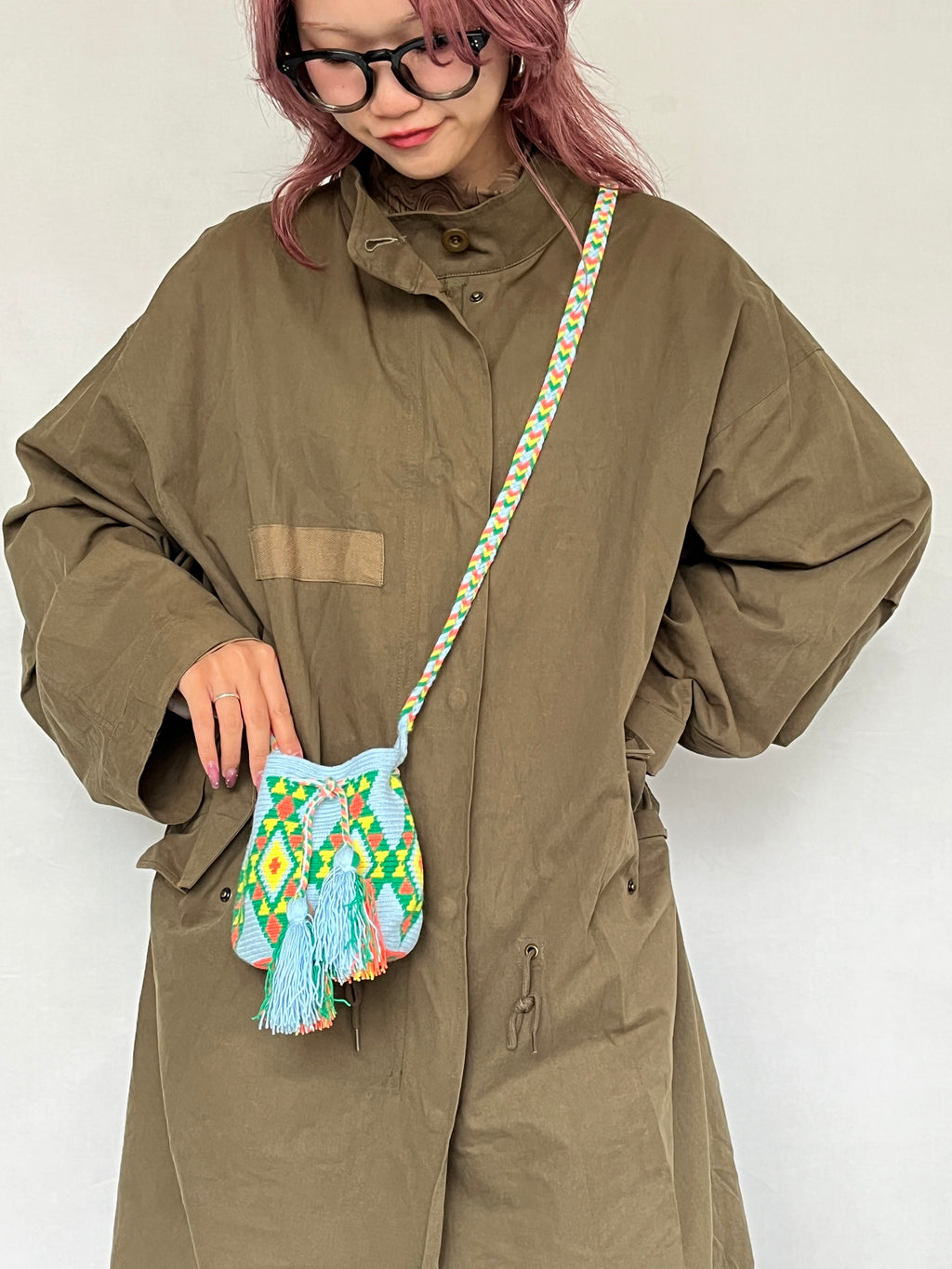 ショルダーバッグとしてだけではなく、持ち手を結んで短くし、ミニバッグのように持っていただくのもおすすめです。