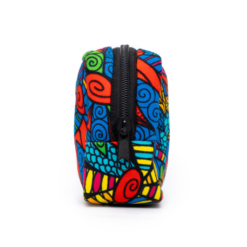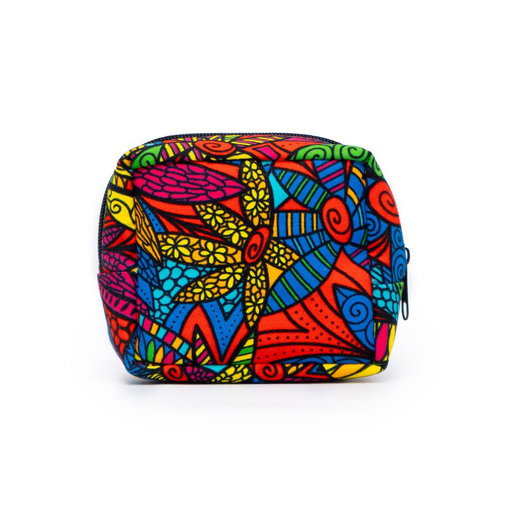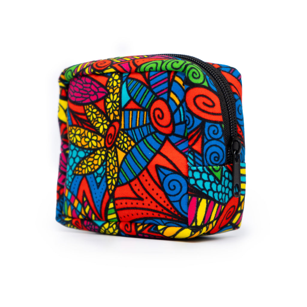 アフリカンプリントを使用した、キューブ型ポーチ。