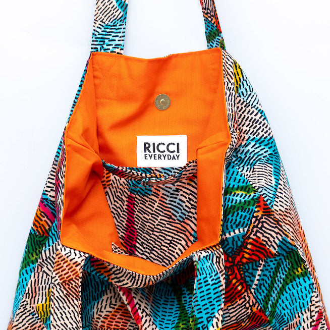 1. RICCI EVERYDAYの製品は、アフリカンワックスプリントの布を使用しています。製品製作時に布に水を通し、色止め加工を施す等、極力、水による色落ちを防ぐようにしております。但し極度な水濡れや摩擦等により色落ちする可能性がありますので、雨の日の使用はお控えいただき、十分にご注意下さい。