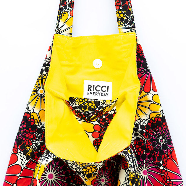 1. RICCI EVERYDAYの製品は、アフリカンワックスプリントの布を使用しています。製品製作時に布に水を通し、色止め加工を施す等、極力、水による色落ちを防ぐようにしております。但し極度な水濡れや摩擦等により色落ちする可能性がありますので、雨の日の使用はお控えいただき、十分にご注意下さい。