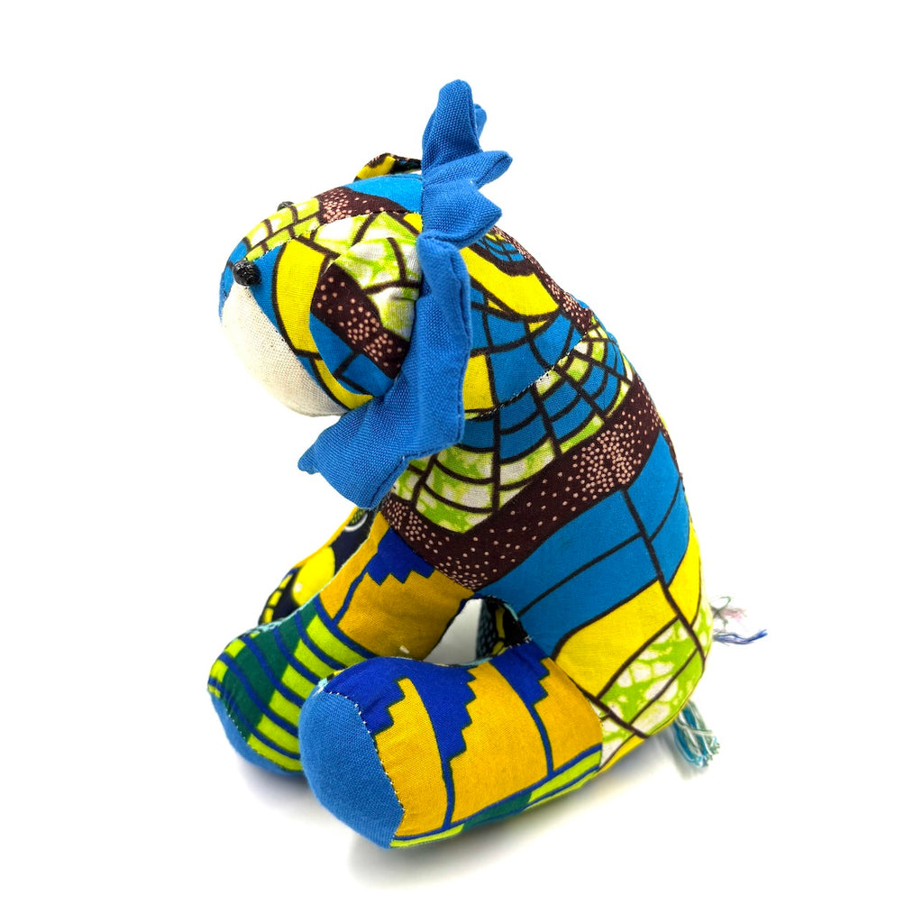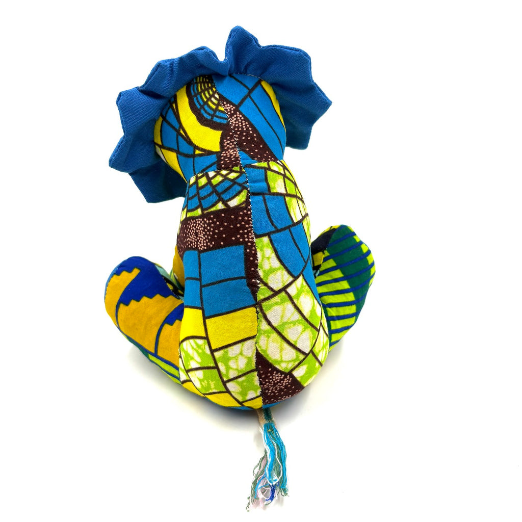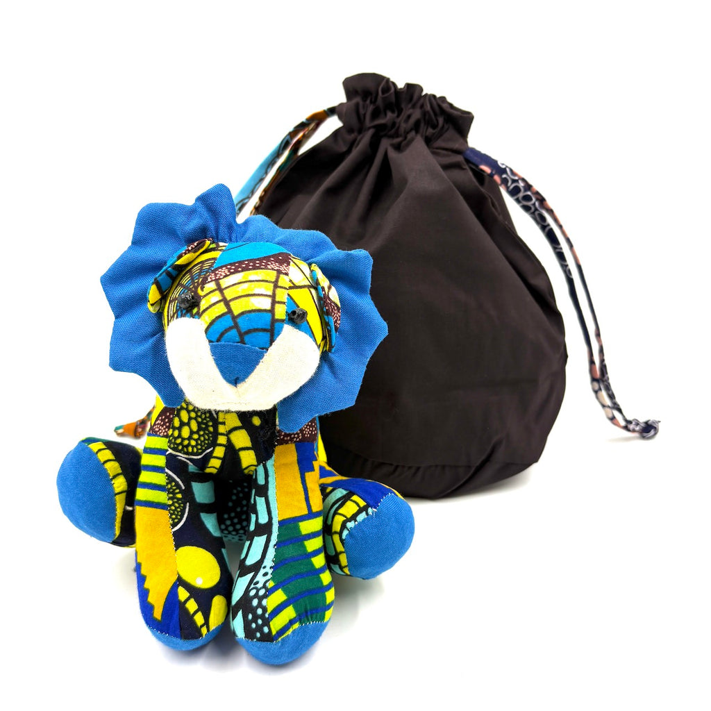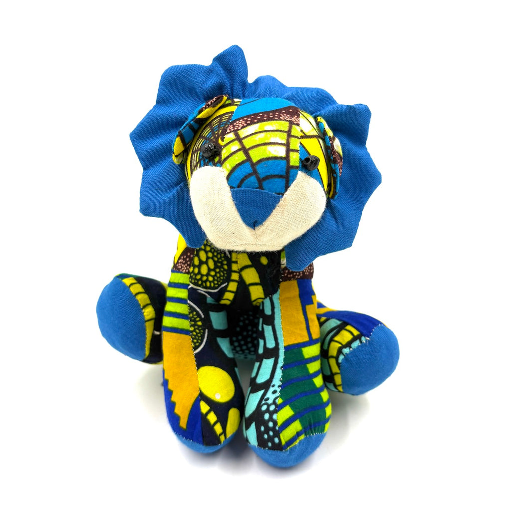 アフリカンプリントのハギレをパッチワークしてできた可愛らしい顔をしたライオンのぬいぐるみです。