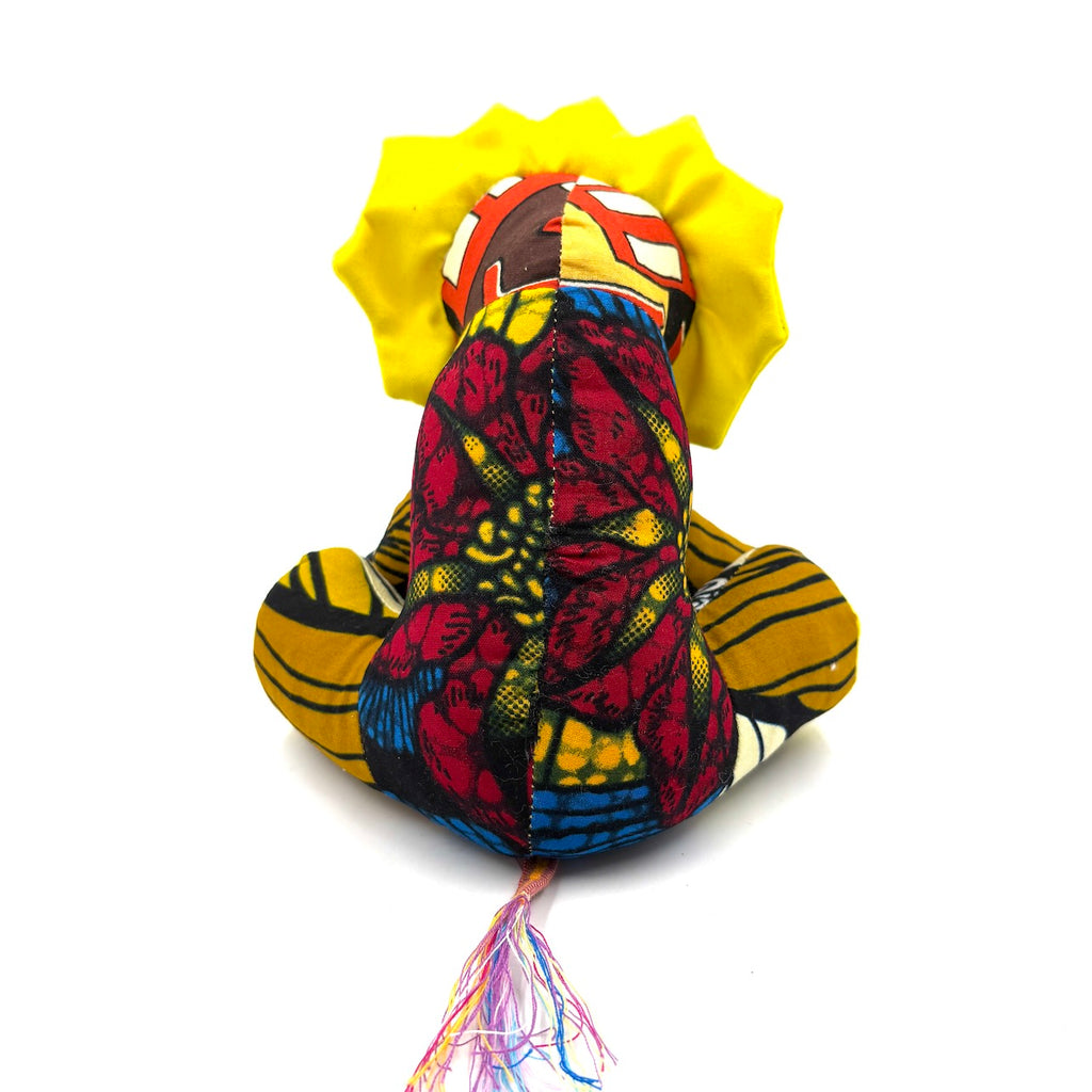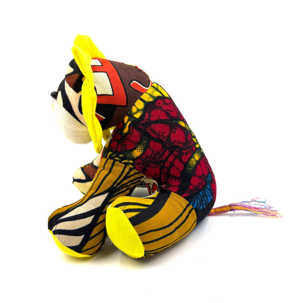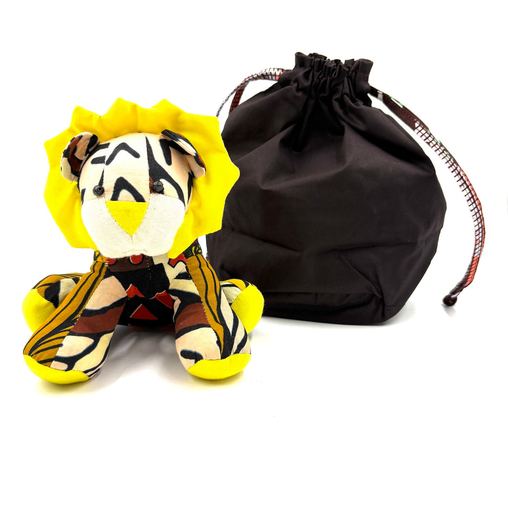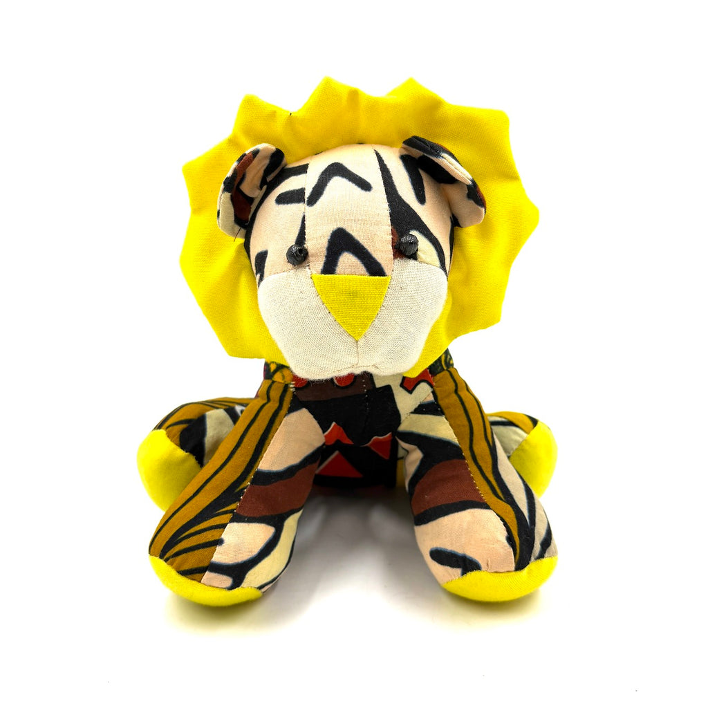 アフリカンプリントのハギレをパッチワークしてできた可愛らしい顔をしたライオンのぬいぐるみです。