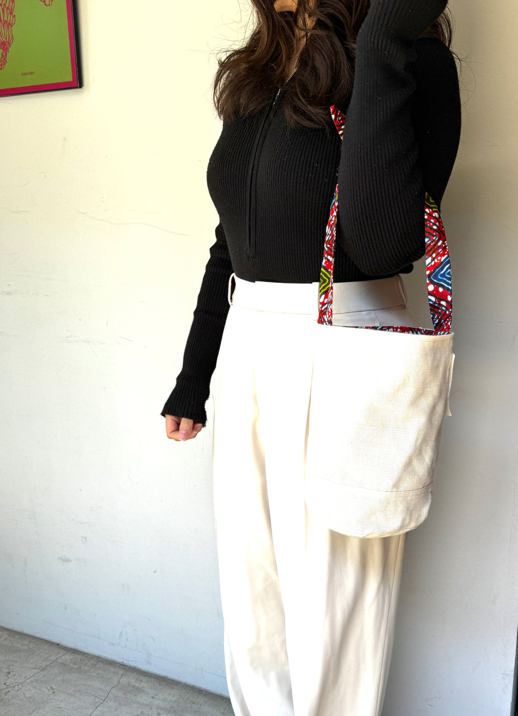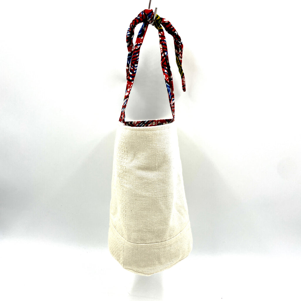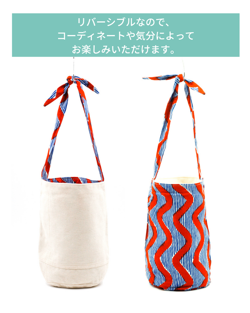 コーディネートによって、アフリカンプリント柄を表にしたり、シンプルに白地を表にしたりと、リバーシブルでお使いいただけるのでとても使い勝手が良いバッグです!