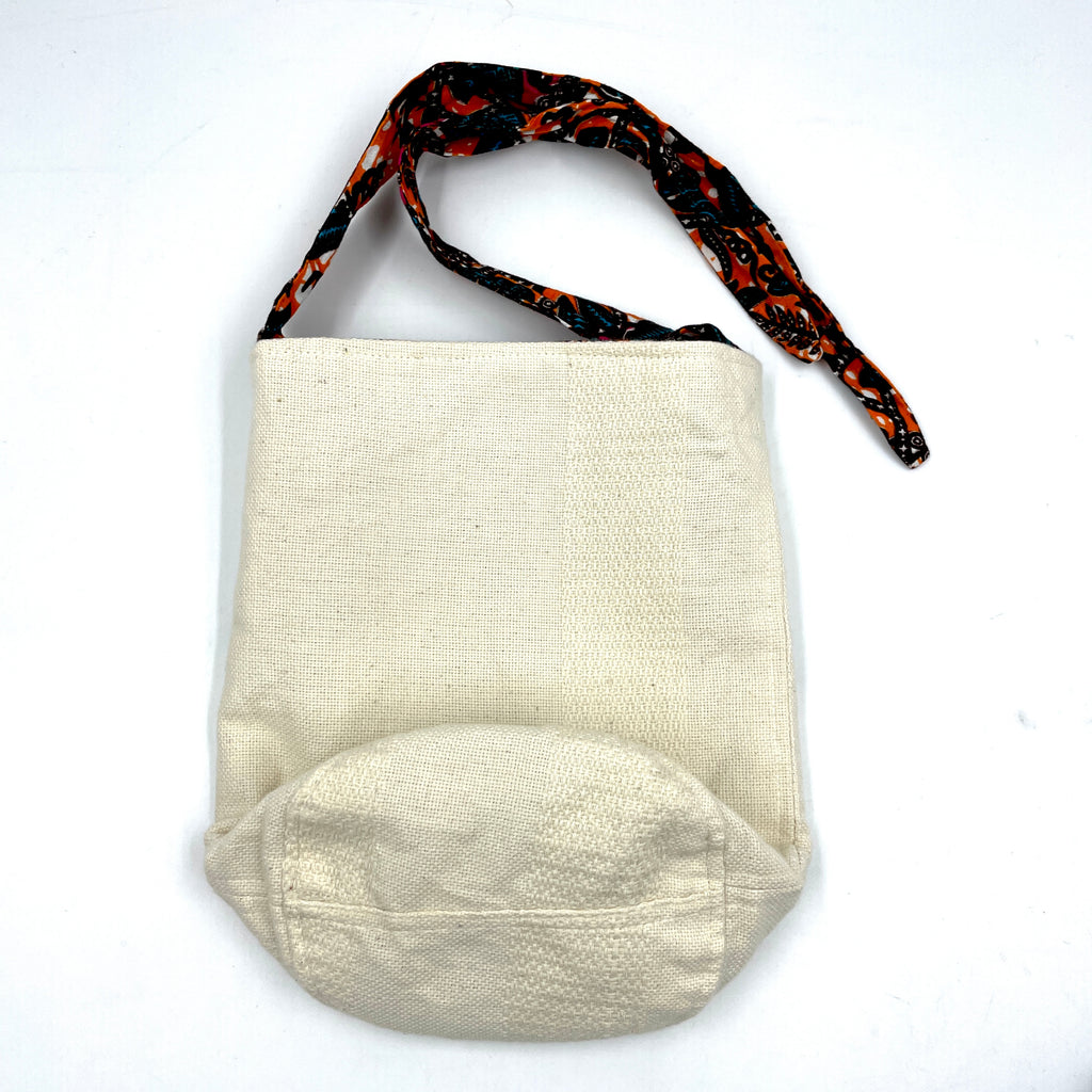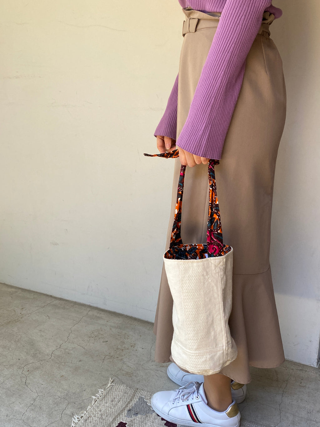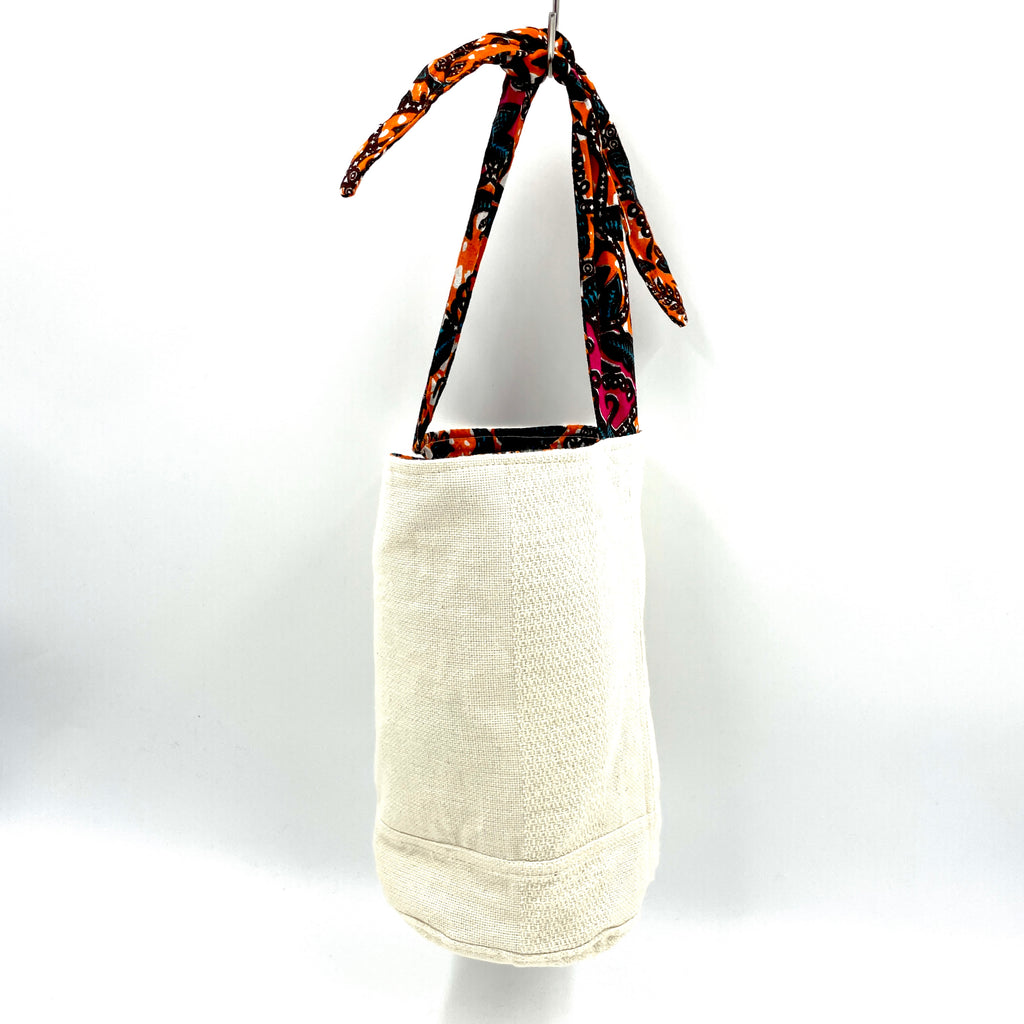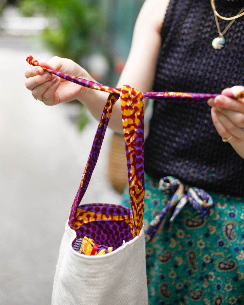 コーディネートによって、アフリカンプリント柄を表にしたり、シンプルに白地を表にしたりと、リバーシブルでお使いいただけるのでとても使い勝手が良いバッグです!