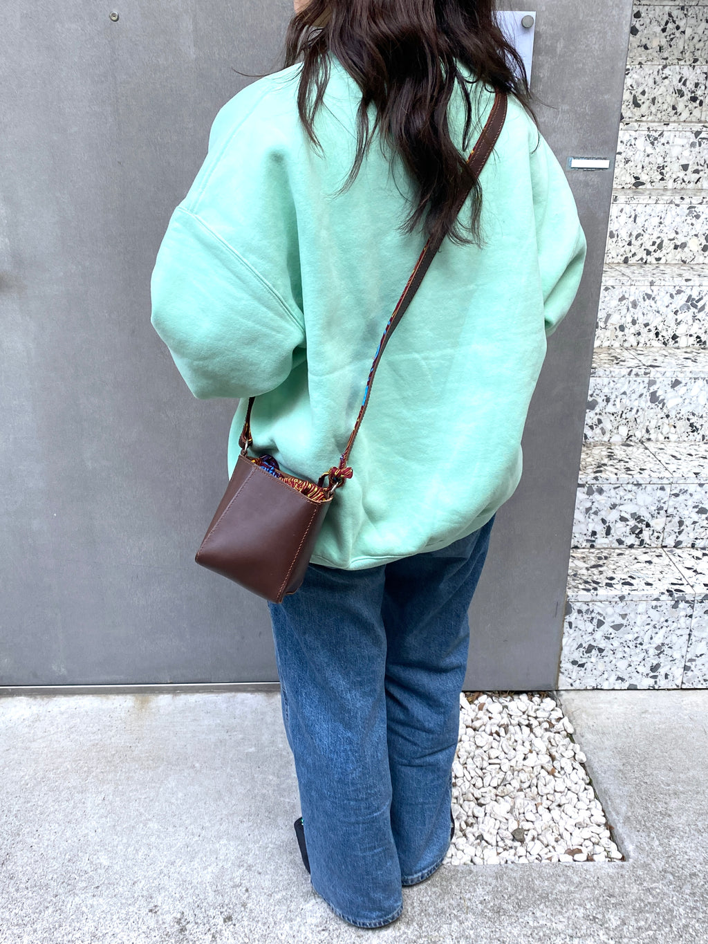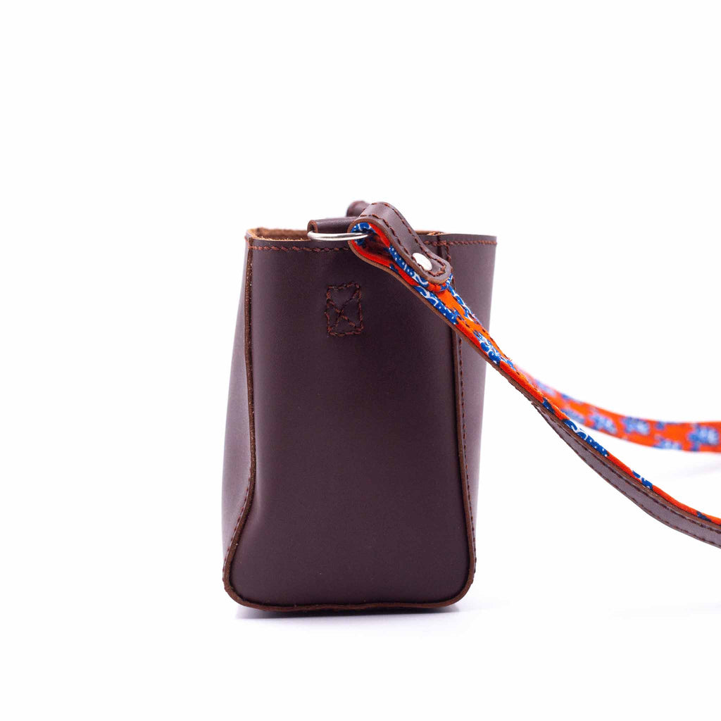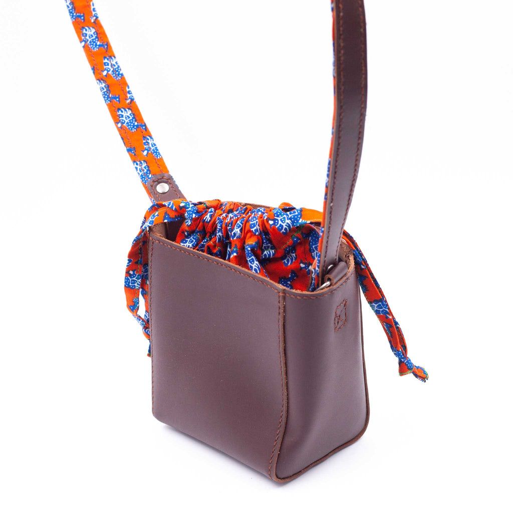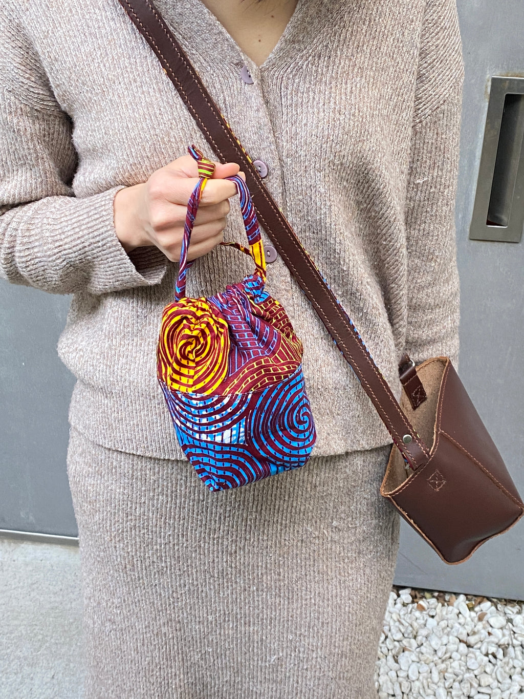 アフリカンプリントの巾着が内袋になっている、小さな斜めがけレザーポシェット。