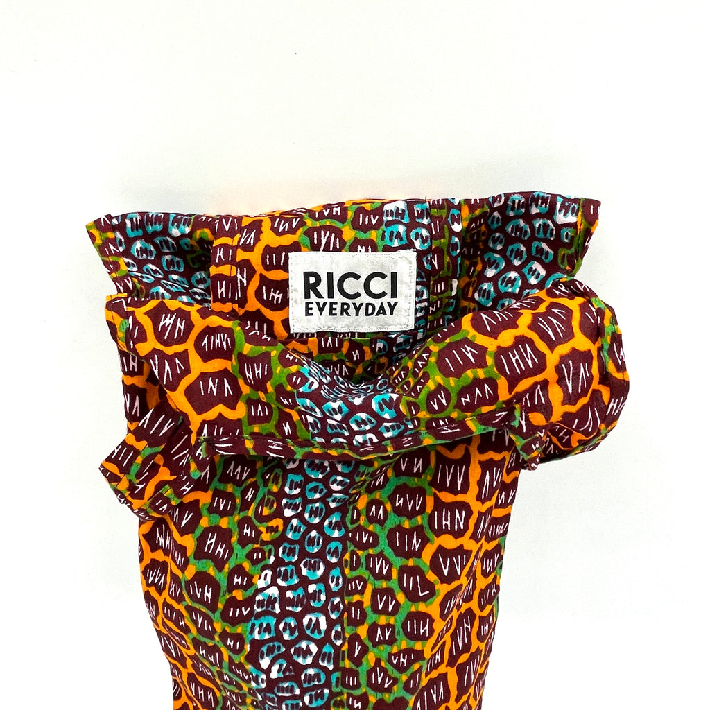 1. RICCI EVERYDAYの製品は、アフリカンワックスプリントの布を使用しています。製品製作時に布に水を通し、色止め加工を施す等、極力、水による色落ちを防ぐようにしております。但し極度な水濡れや摩擦等により色落ちする可能性がありますので、雨の日の使用はお控えいただき、十分にご注意下さい。