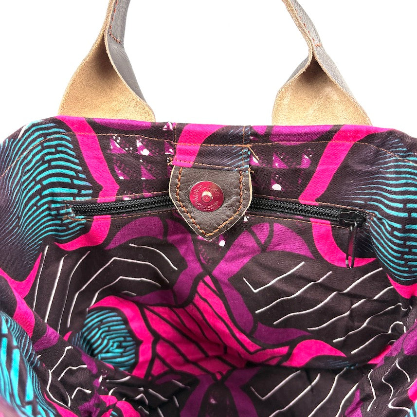 バッグの内側は、RICCI EVERYDAYらしい、カラフルでプレイフルなアフリカンプリントで彩っています。