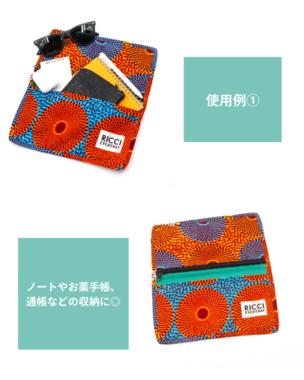 1. RICCI EVERYDAYの製品は、アフリカンワックスプリントの布を使用しています。製品製作時に布に水を通し、色止め加工を施す等、極力、水による色落ちを防ぐようにしております。但し極度な水濡れや摩擦等により色落ちする可能性がありますので、雨の日の使用はお控えいただき、十分にご注意下さい。