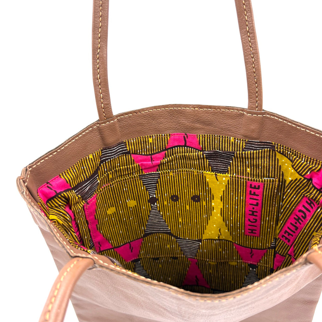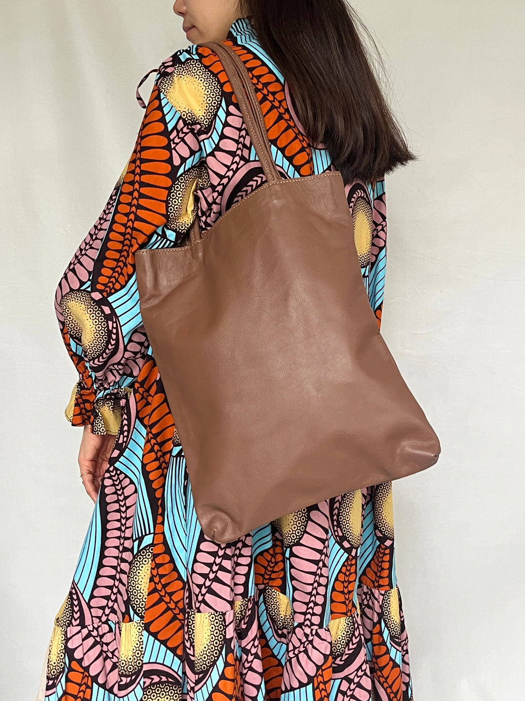 ウガンダでなめされたレザーを使用し、手縫いで仕上げたレザートートバッグ。