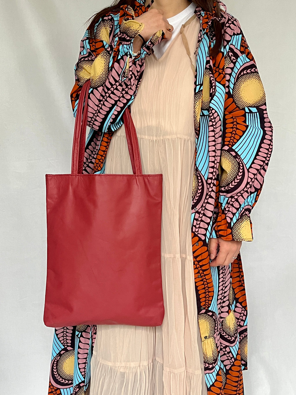 ウガンダでなめされたレザーを使用し、手縫いで仕上げたレザートートバッグ。