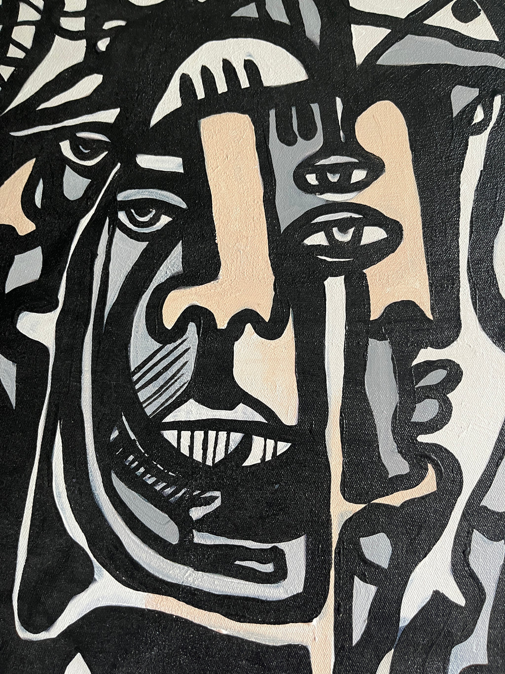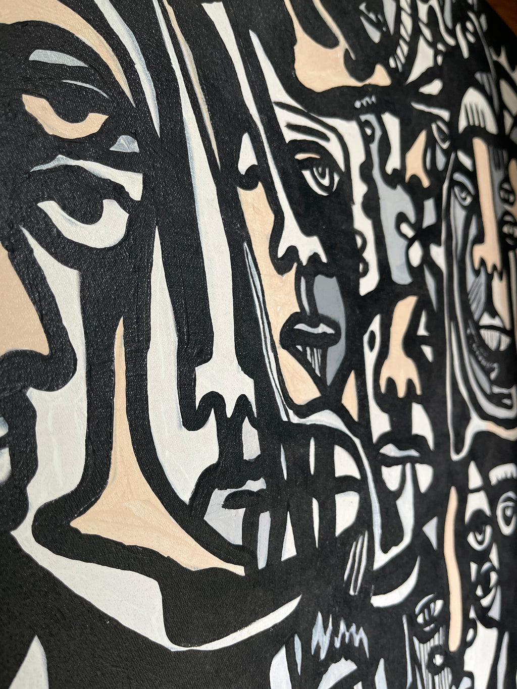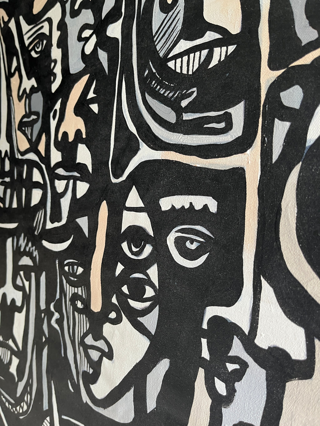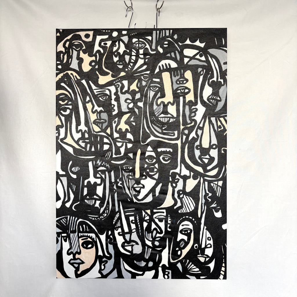 こちらの絵画には、ブラックとホワイトを中心に、たくさんの人の顔がひしめき合うように描かれています。人によっては、見える顔の数が違うかもしれません。そんな多様な解釈ができる絵画です。