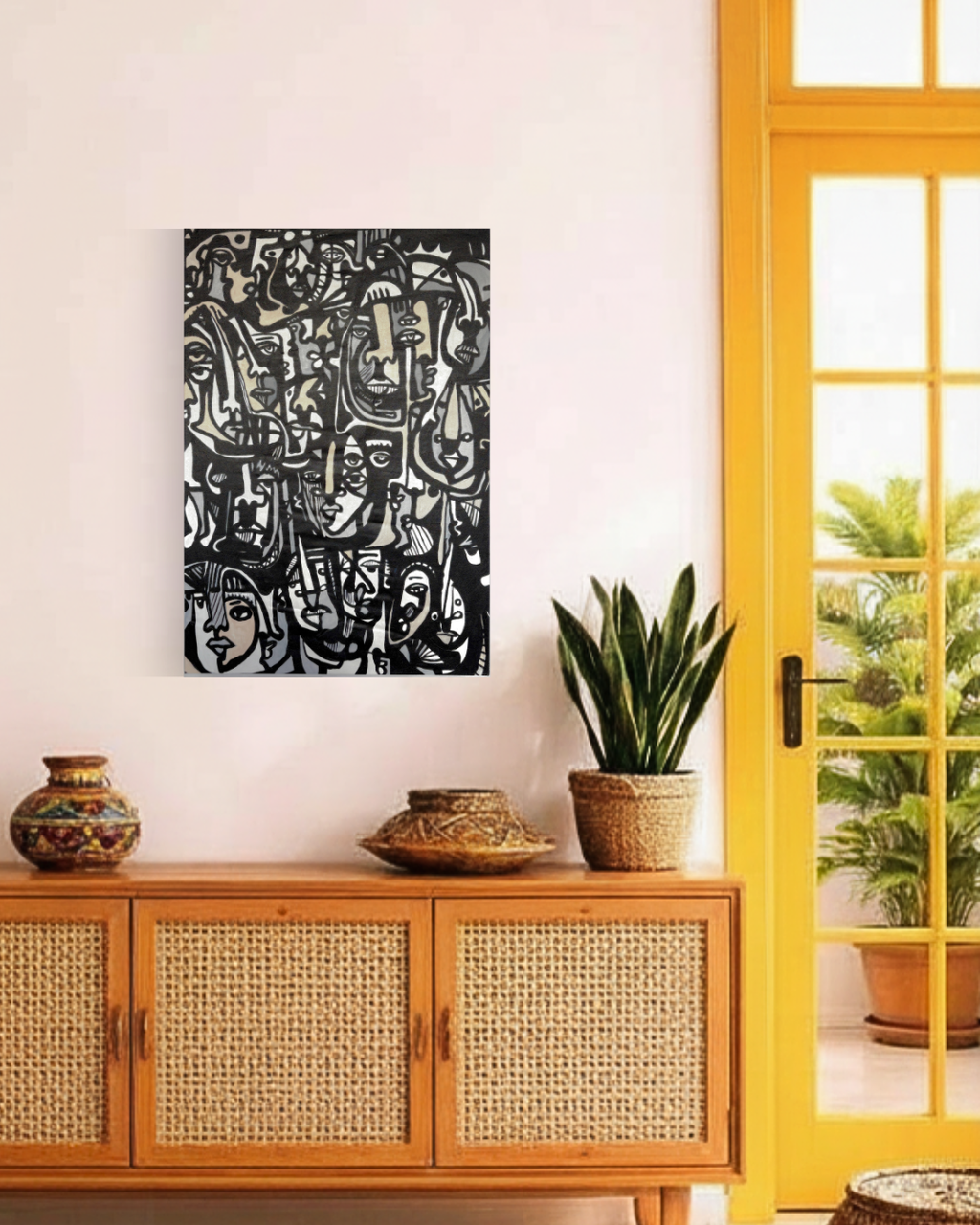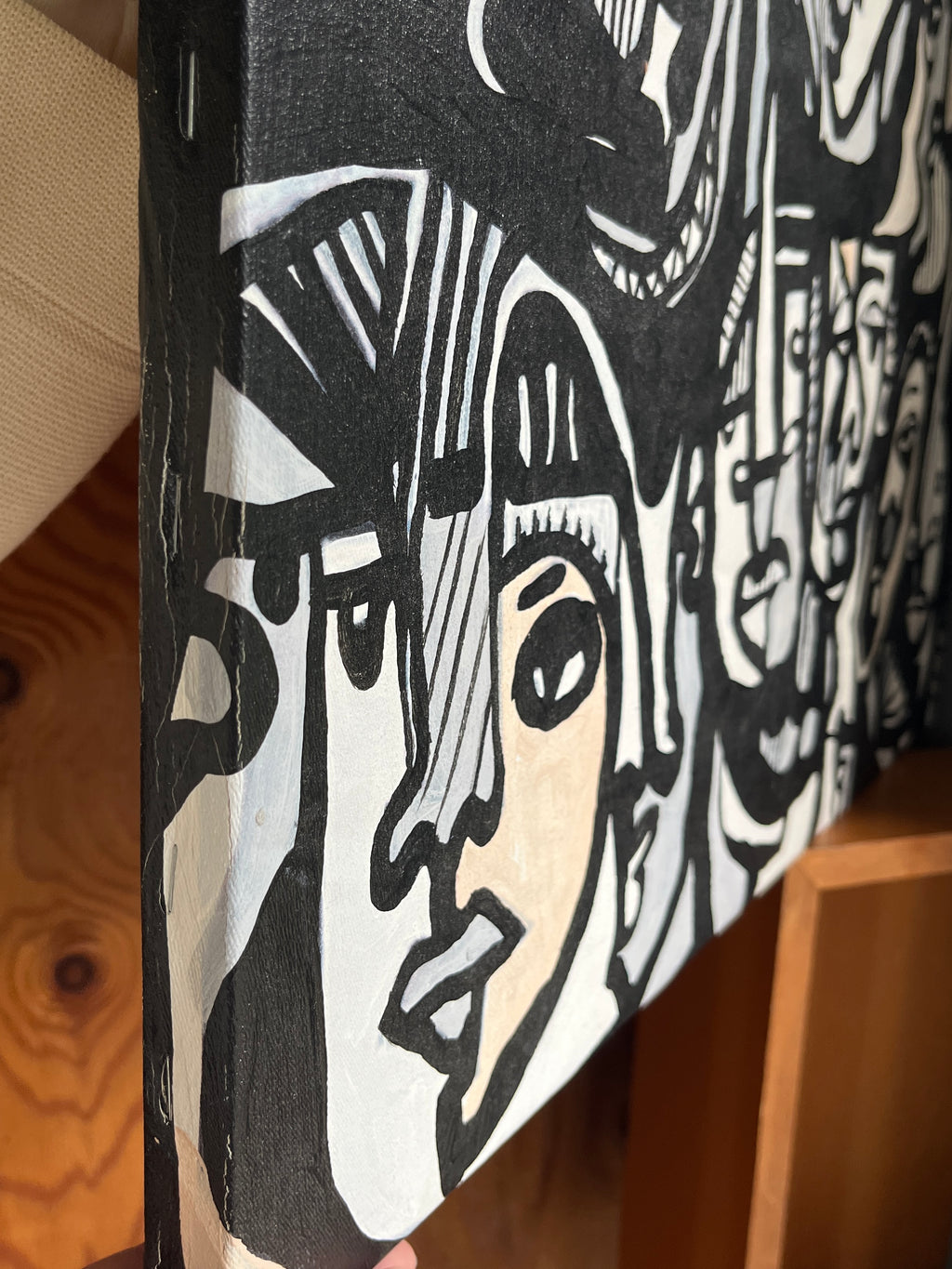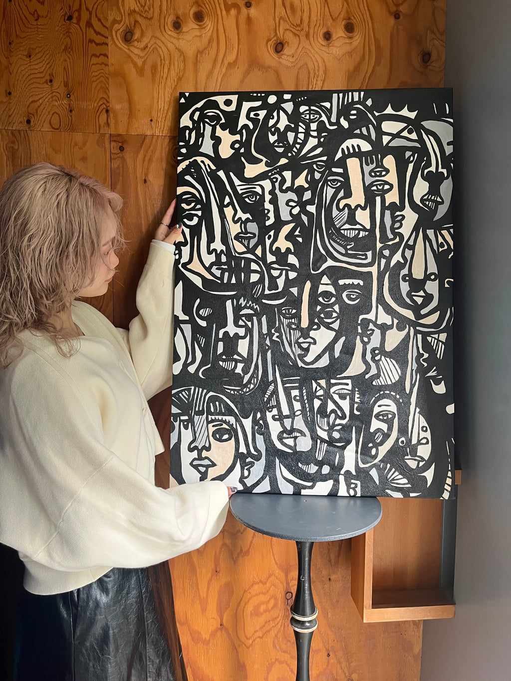 こちらの絵画には、ブラックとホワイトを中心に、たくさんの人の顔がひしめき合うように描かれています。人によっては、見える顔の数が違うかもしれません。そんな多様な解釈ができる絵画です。
