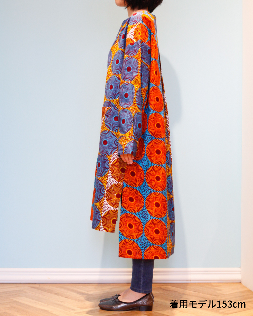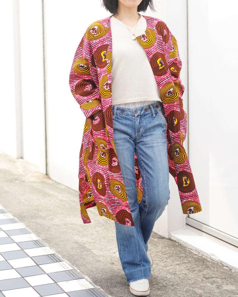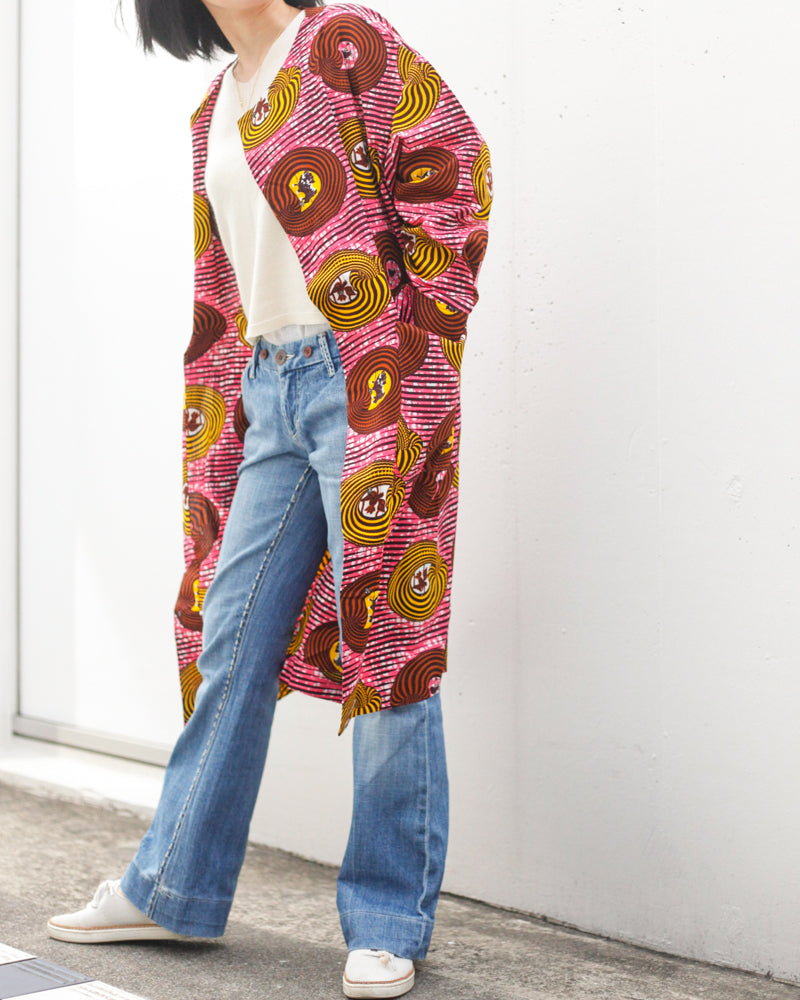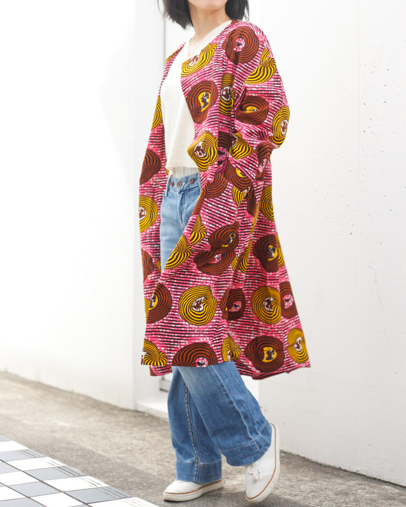 シンプルなラインで、サラリとまとえるコートドレス。ワンピースとして着ていただくこともできますし、羽織として使っていただくことも可能です。大きなポケットが可愛らしさを演出しています。