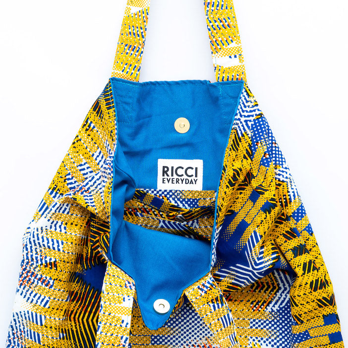 1. RICCI EVERYDAYの製品は、アフリカンワックスプリントの布を使用しています。製品製作時に布に水を通し、色止め加工を施す等、極力、水による色落ちを防ぐようにしております。但し極度な水濡れや摩擦等により色落ちする可能性がありますので、雨の日の使用はお控えいただき、十分にご注意下さい。