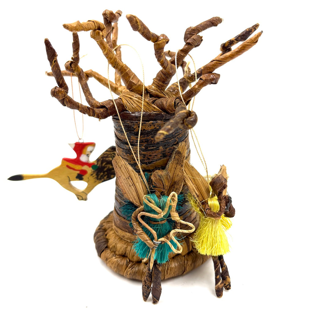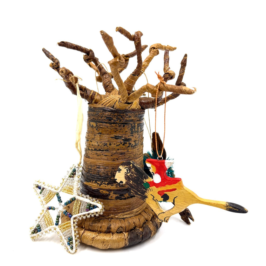 バナナファイバーでできたミニサイズのバオバブツリーに、さまざまなクリスマスオーナメントをつけて、ウガンダらしいユニークなセットを作りました。
