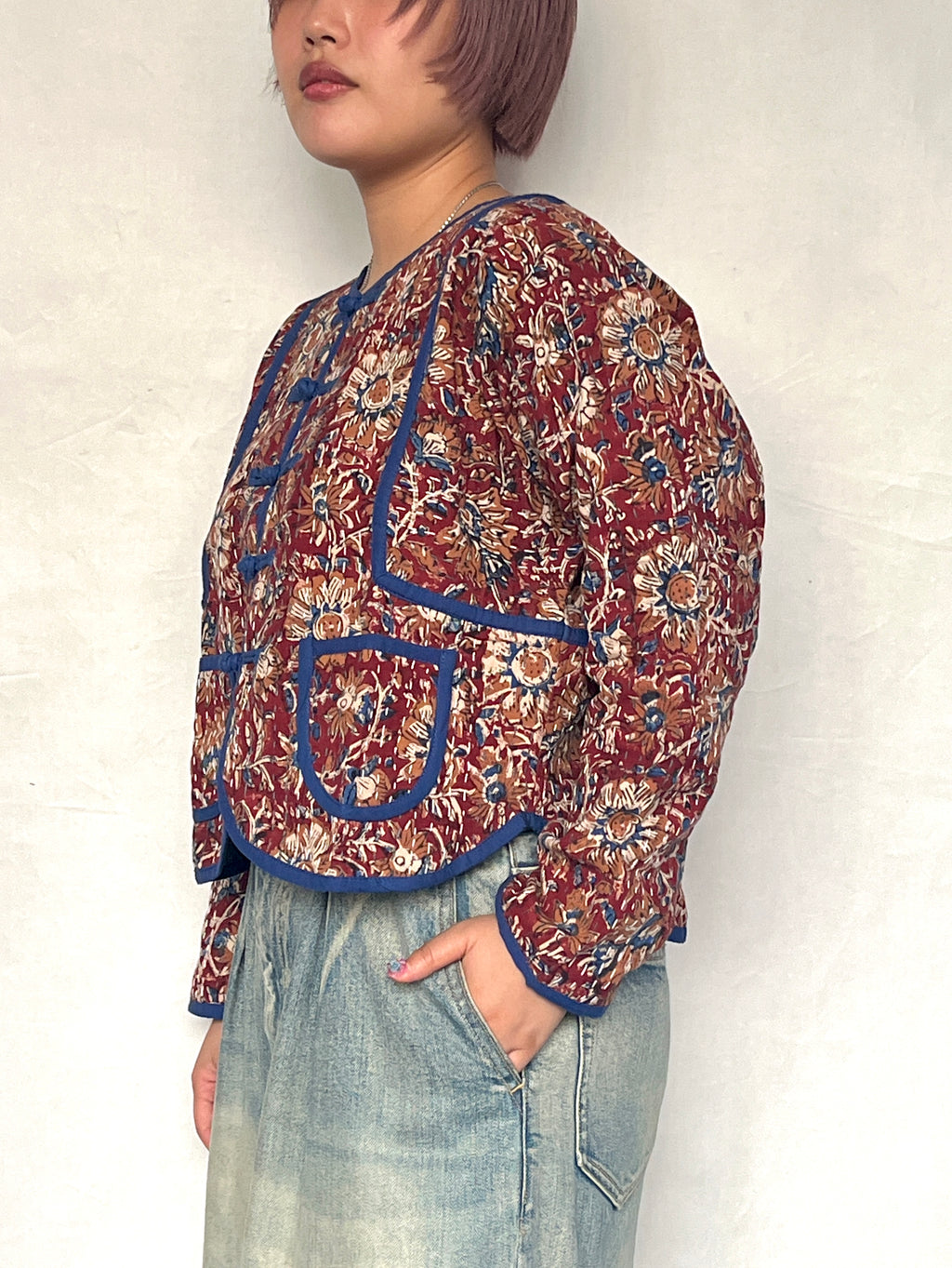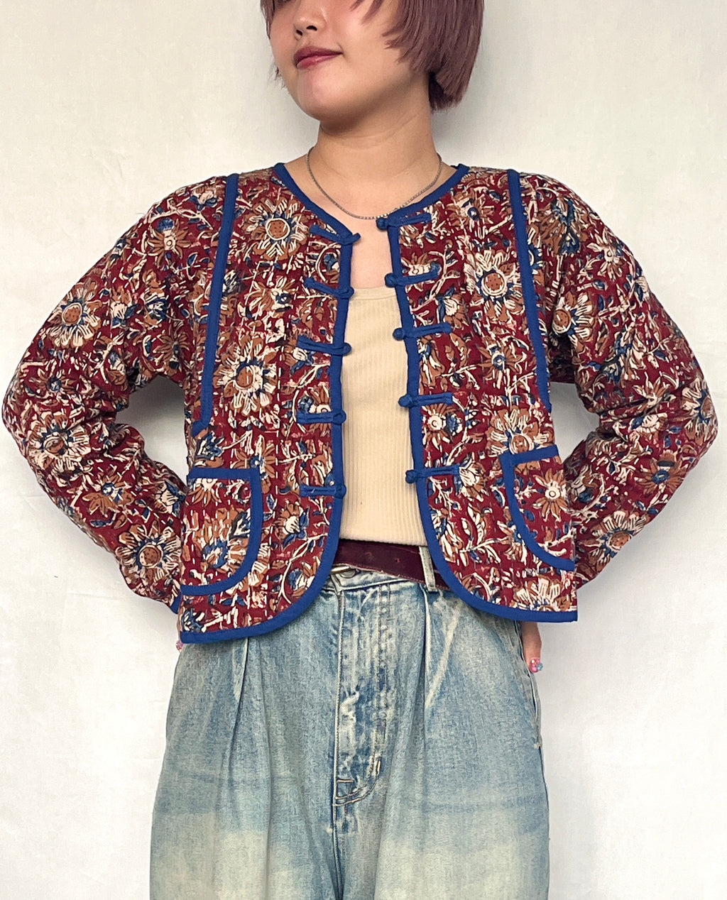 ブロックプリントカンタ80sジャケットは、インド綿をベースにカラーパイピングでアクセントを付けたジャケットです。そこまで厚手ではないので、少し何かを羽織りたい秋口のファッションにぴったり。ポケットが付いているのも、嬉しいポイントです。