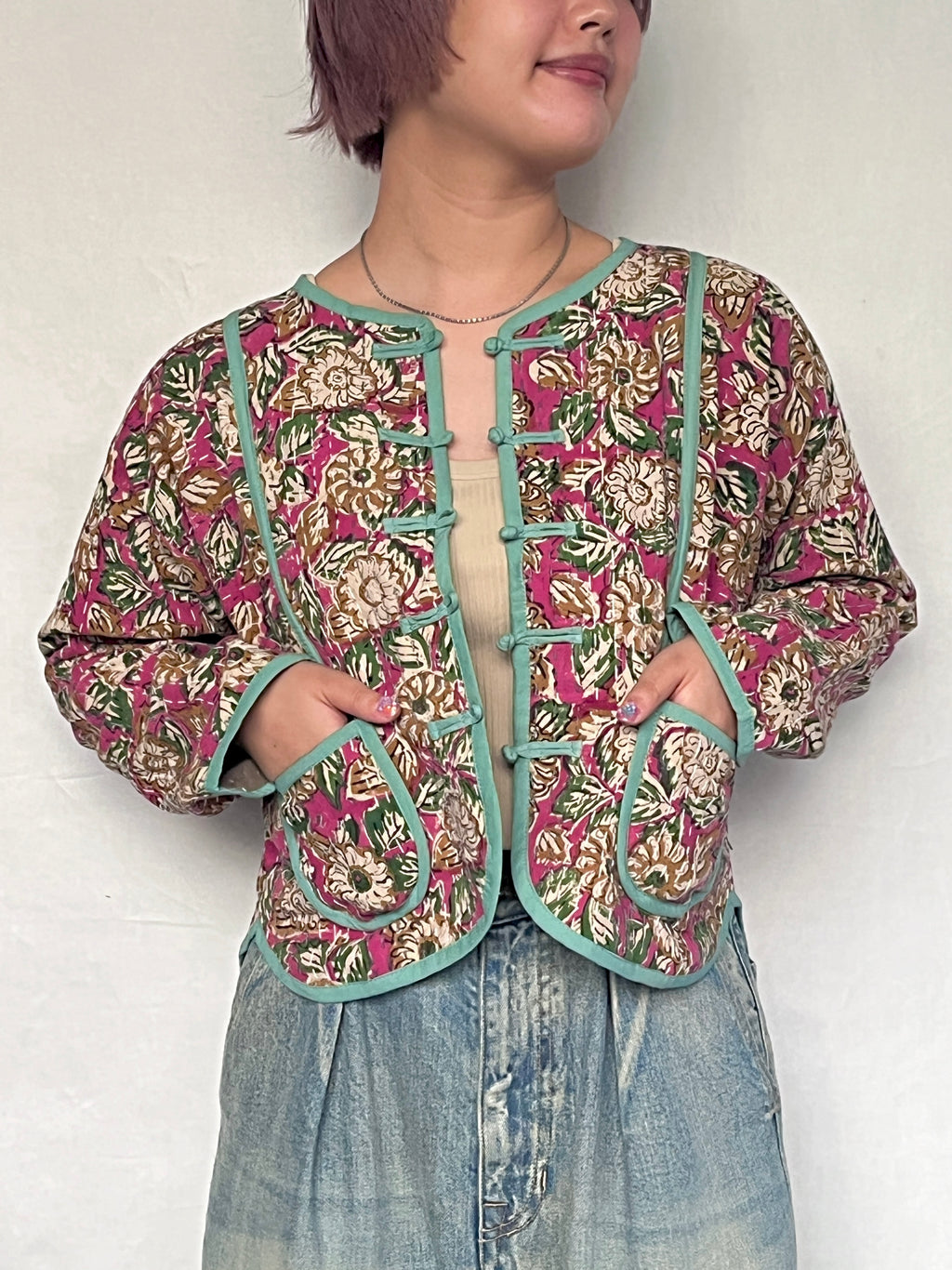 ブロックプリントカンタ80sジャケットは、インド綿をベースにカラーパイピングでアクセントを付けたジャケットです。そこまで厚手ではないので、少し何かを羽織りたい秋口のファッションにぴったり。ポケットが付いているのも、嬉しいポイントです。