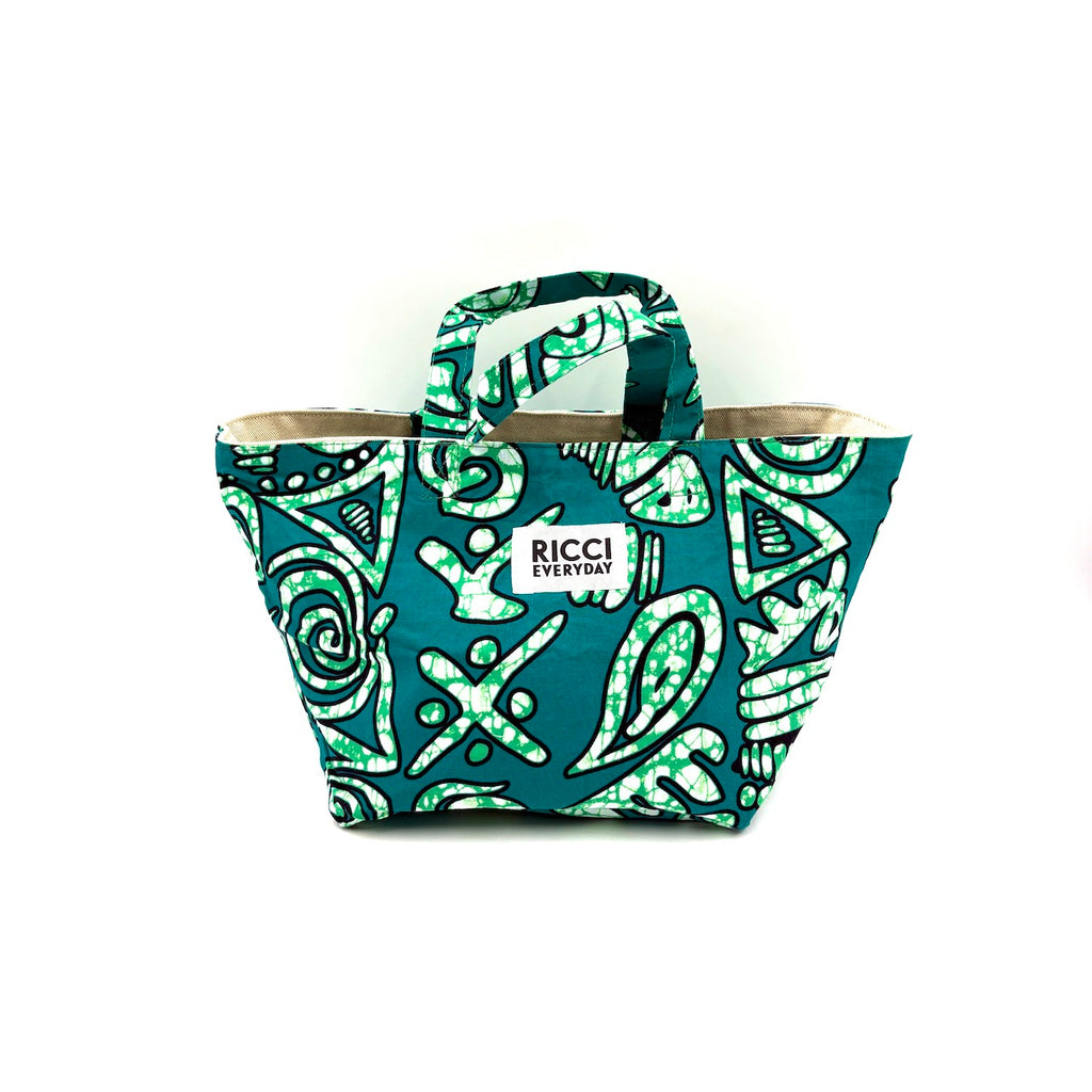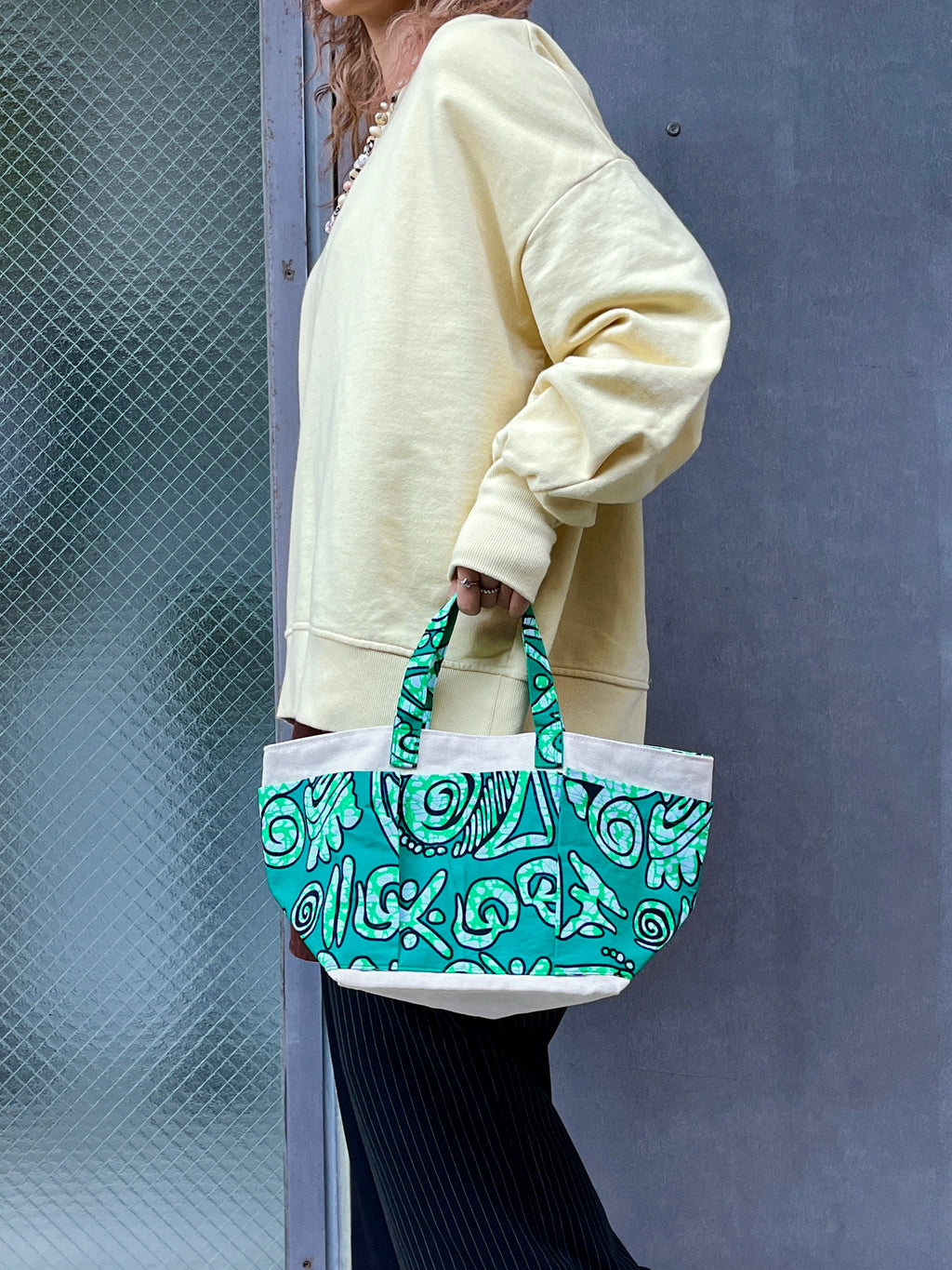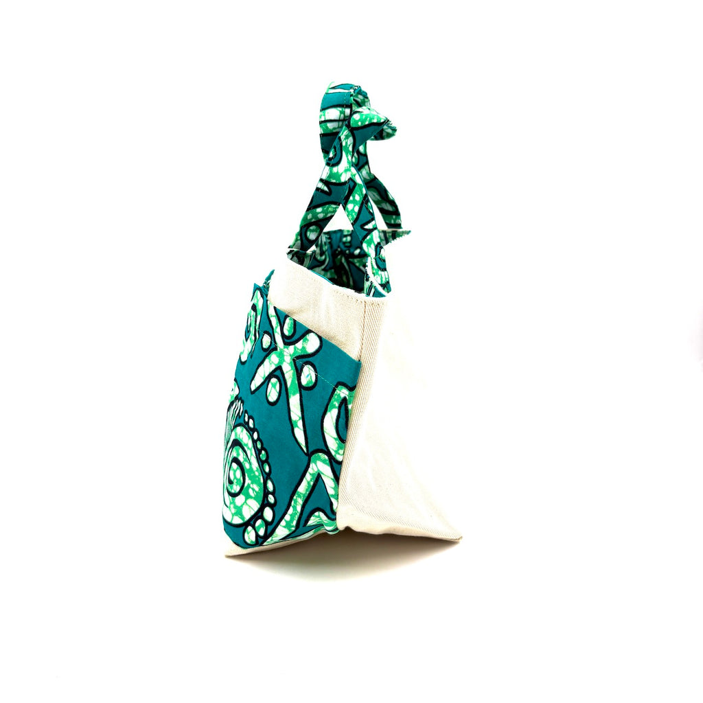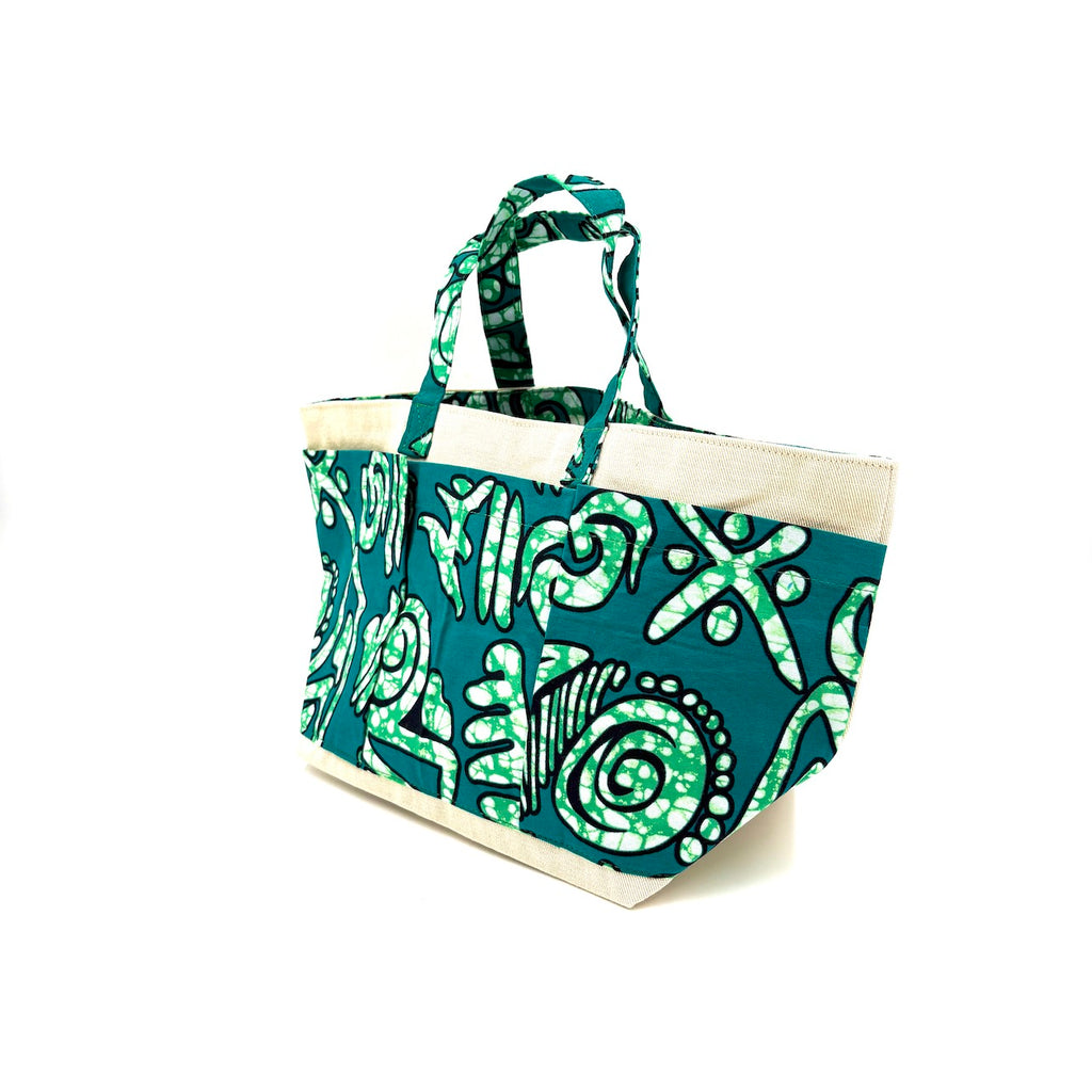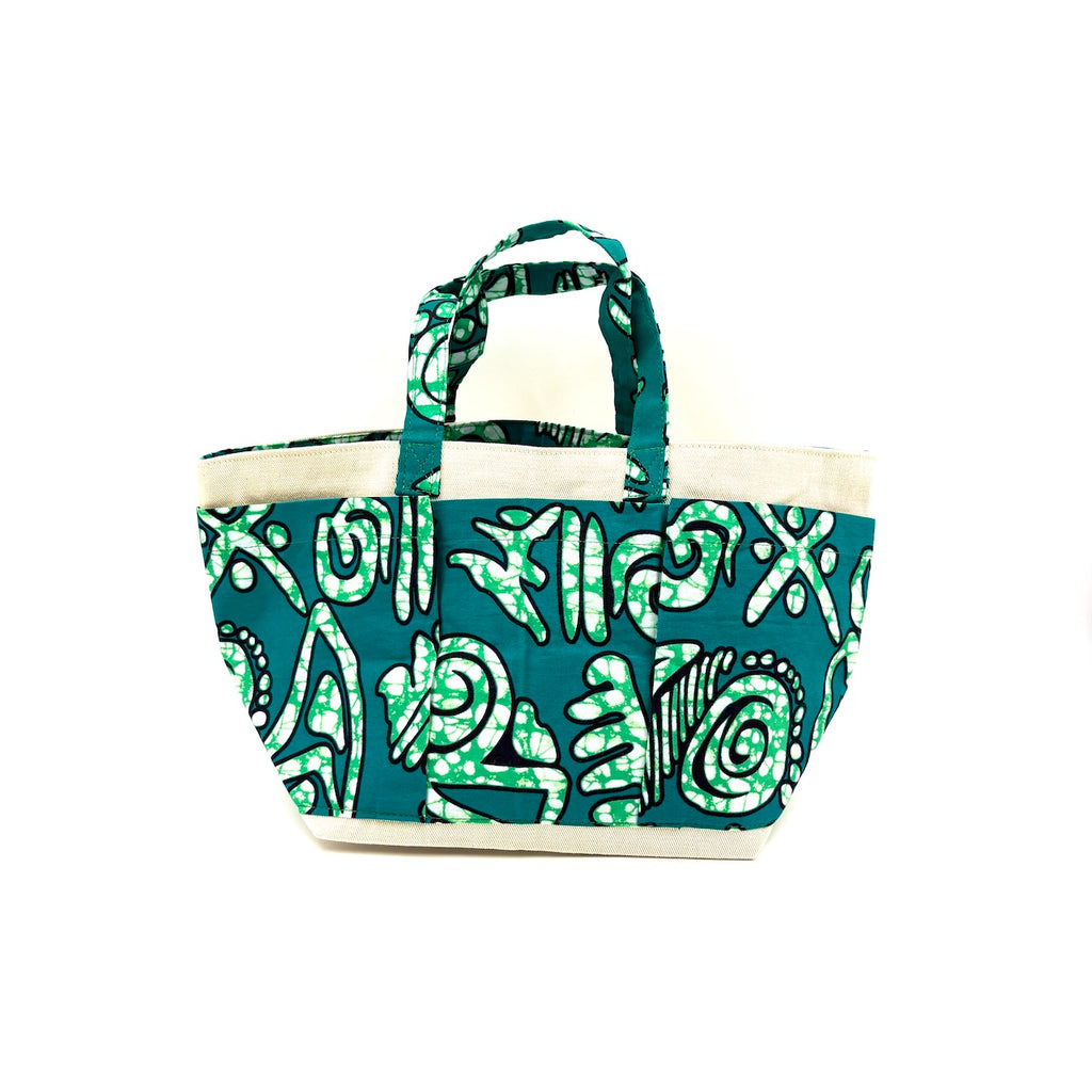 アフリカンプリントとオフホワイトのコットンを組み合わせたランチトート。