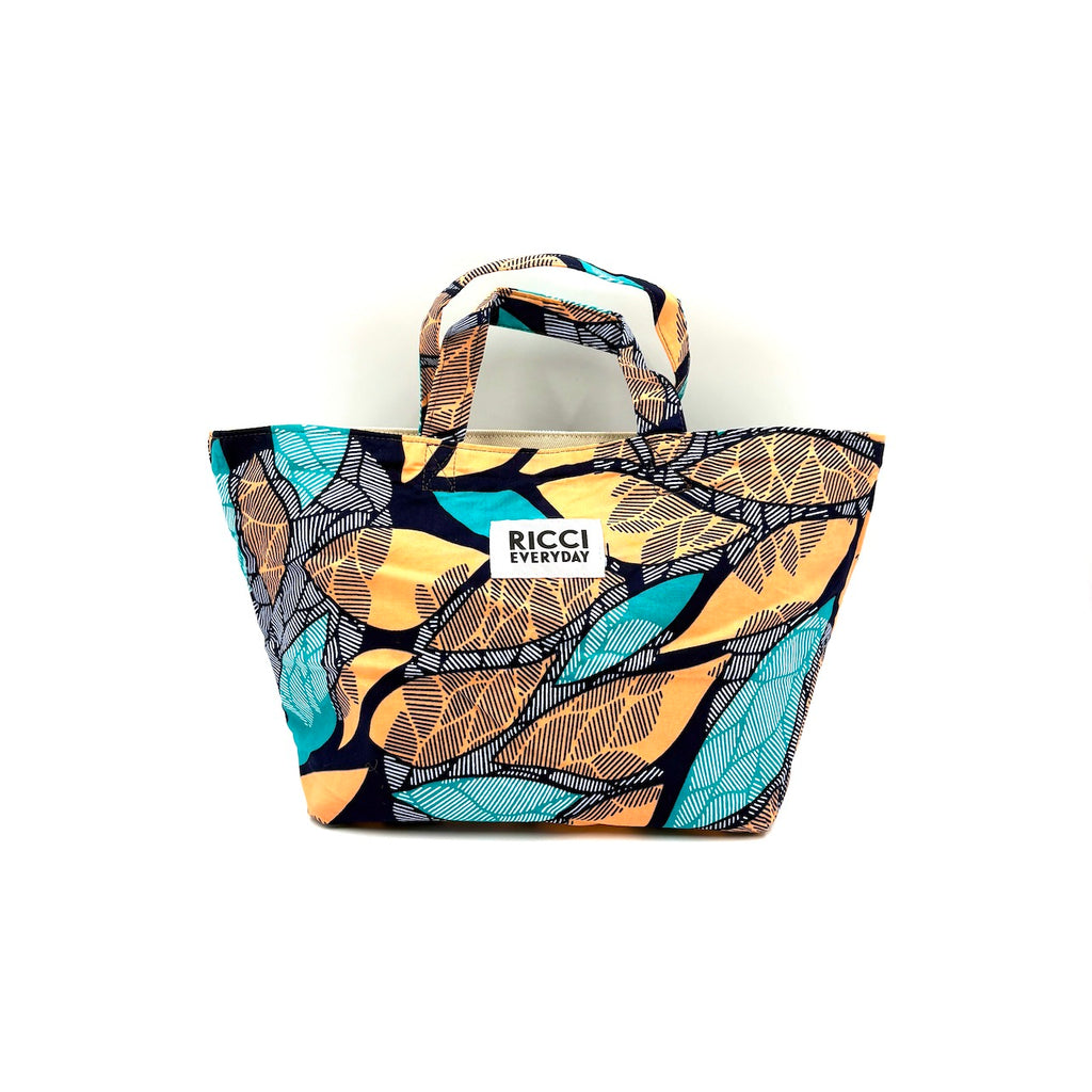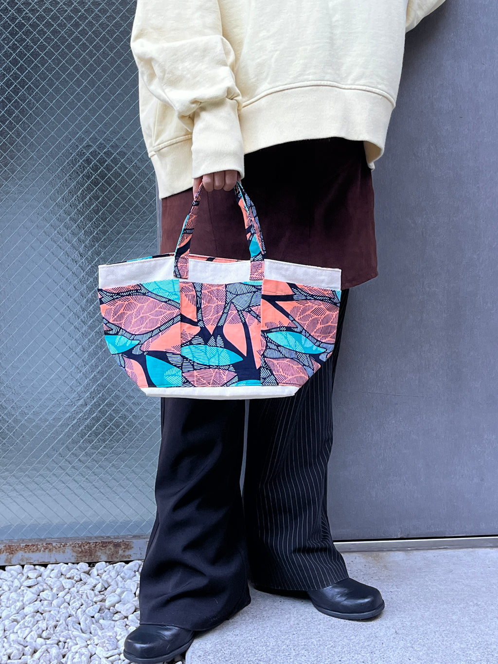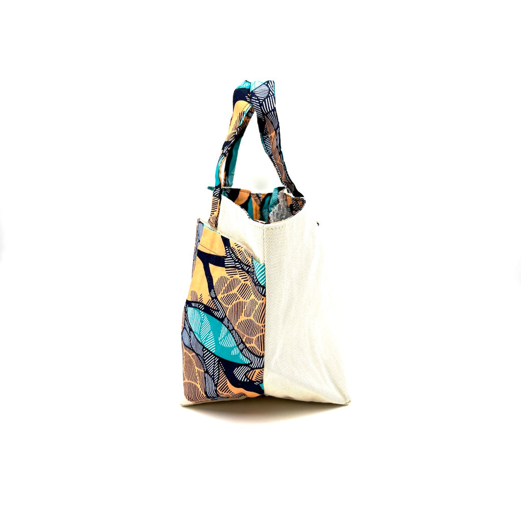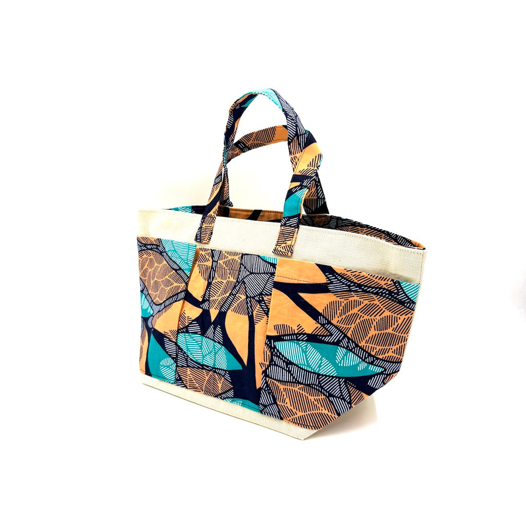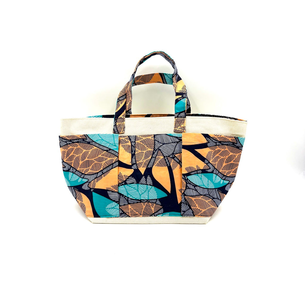 アフリカンプリントとオフホワイトのコットンを組み合わせたランチトート。