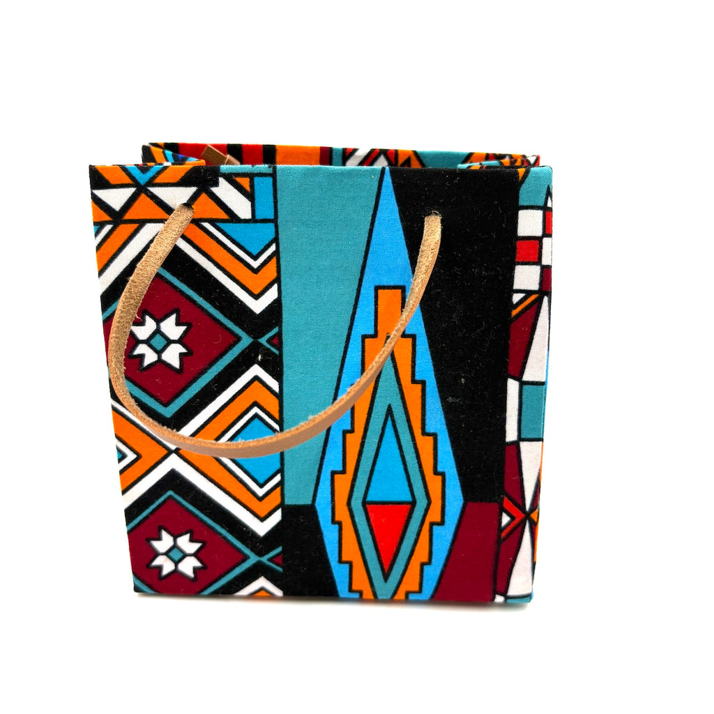 アフリカンプリントでできた、手の平サイズの可愛らしいテディベアと、ギフトバッグのセットです。