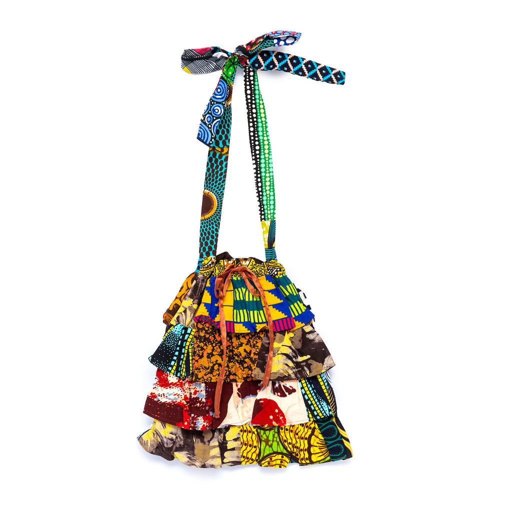 ウガンダ工房にて製品生産で出たハギレを使用しており、どの柄のハギレを使用するかによって、色合いや表情が変わります。その時々にあるハギレで制作しているため、どれひとつとして同じものはなく、ひとつひとつが違う表情を見せる、まさにオリジナルのバッグです。