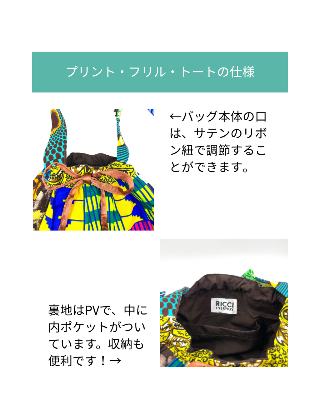 1. RICCI EVERYDAYの製品は、アフリカンワックスプリントの布を使用しています。製品製作時に布に水を通し、色止め加工を施す等、極力、水による色落ちを防ぐようにしております。但し極度な水濡れや摩擦等により色落ちする可能性がありますので、雨の日の使用はお控えいただき、十分にご注意下さい。