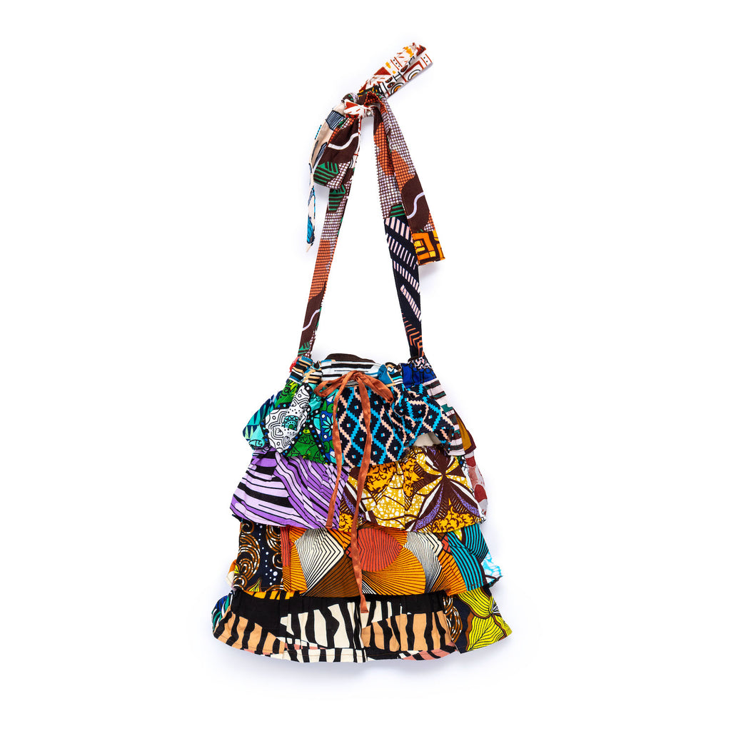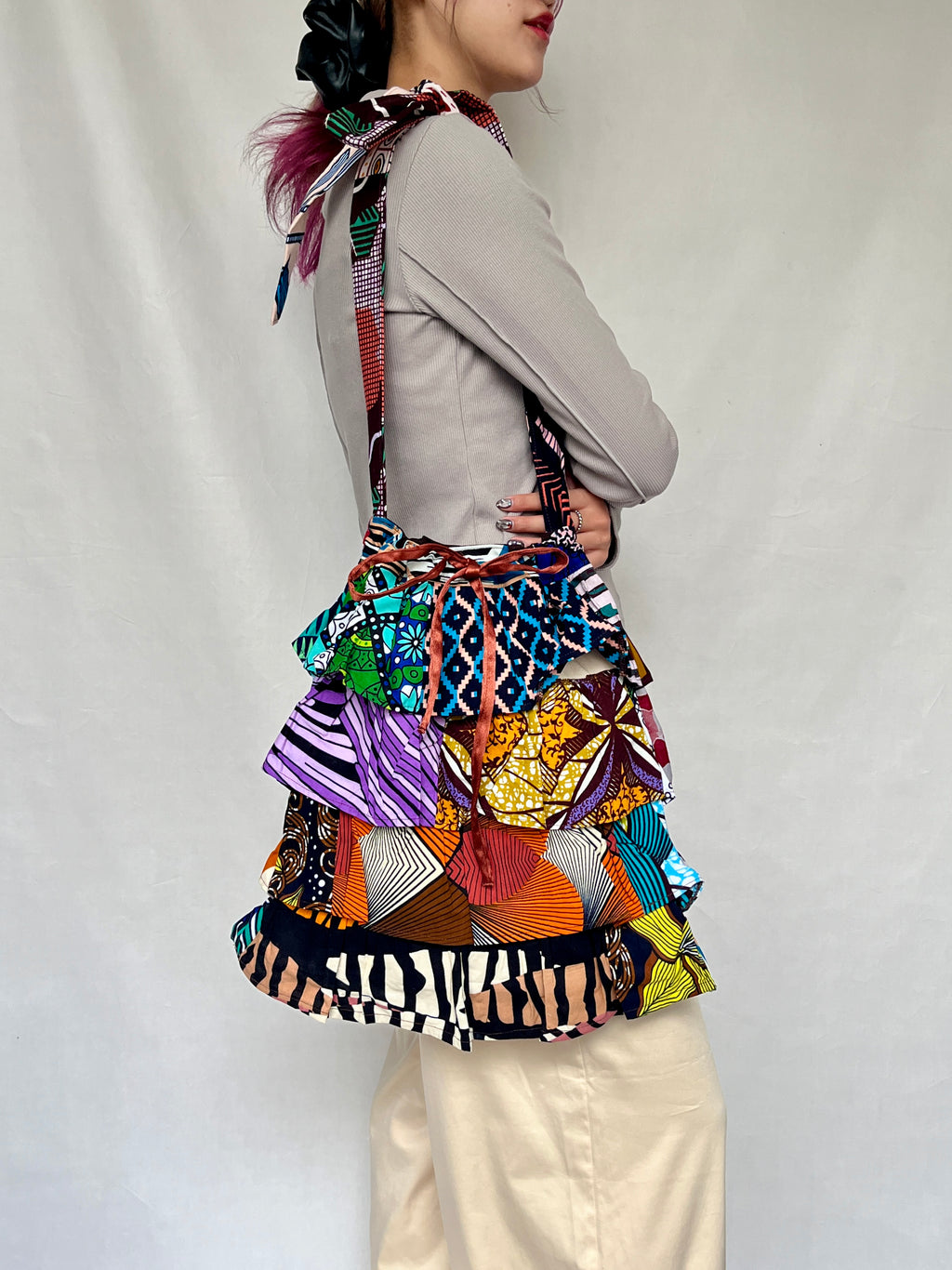 ウガンダ工房にて製品生産で出たハギレを使用しており、どの柄のハギレを使用するかによって、色合いや表情が変わります。その時々にあるハギレで制作しているため、どれひとつとして同じものはなく、ひとつひとつが違う表情を見せる、まさにオリジナルのバッグです。