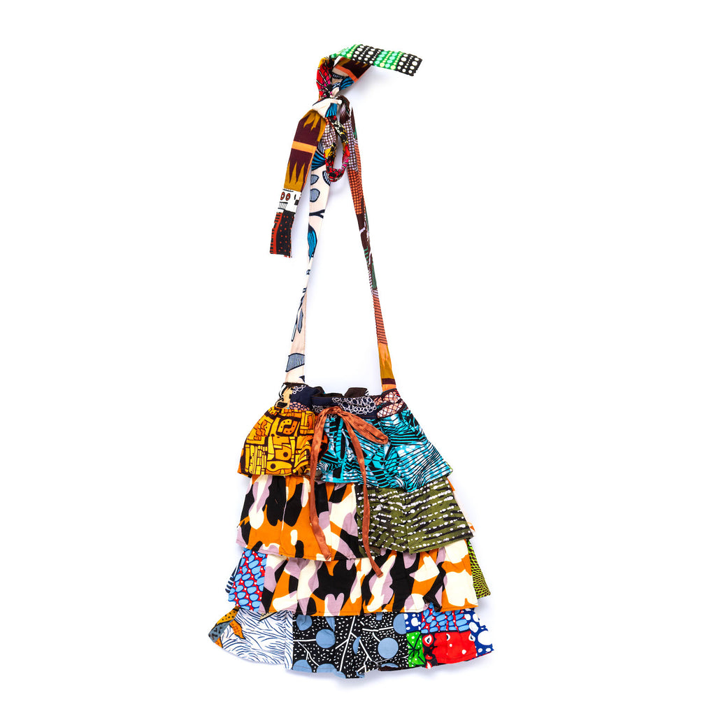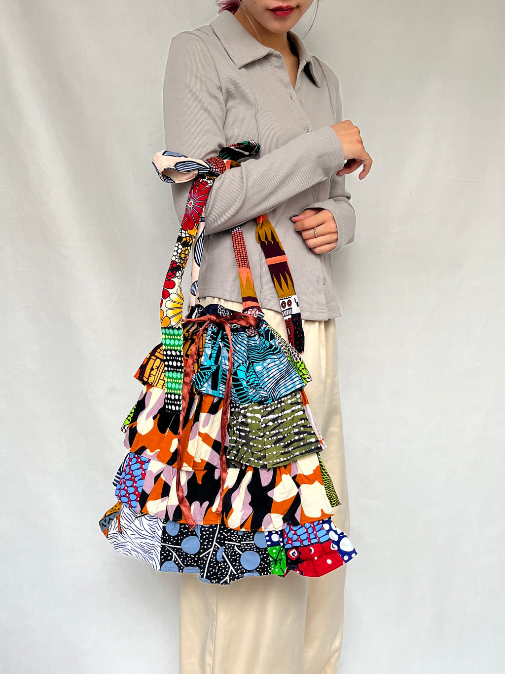 ウガンダ工房にて製品生産で出たハギレを使用しており、どの柄のハギレを使用するかによって、色合いや表情が変わります。その時々にあるハギレで制作しているため、どれひとつとして同じものはなく、ひとつひとつが違う表情を見せる、まさにオリジナルのバッグです。