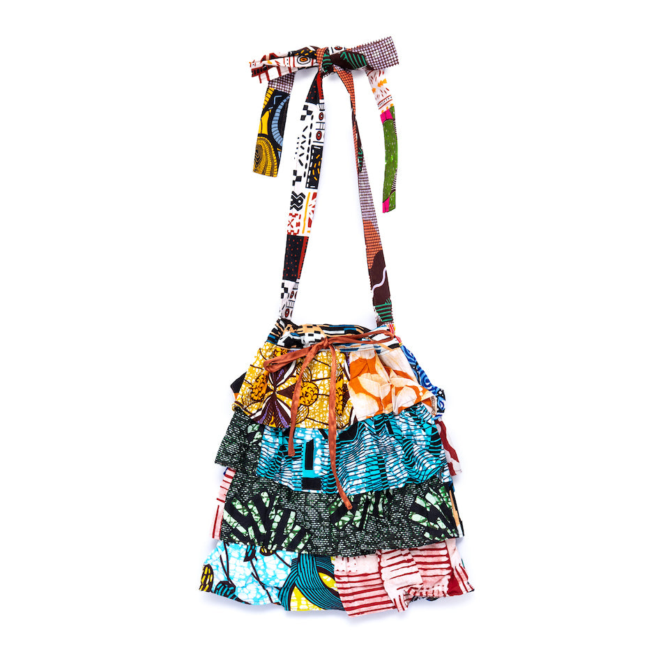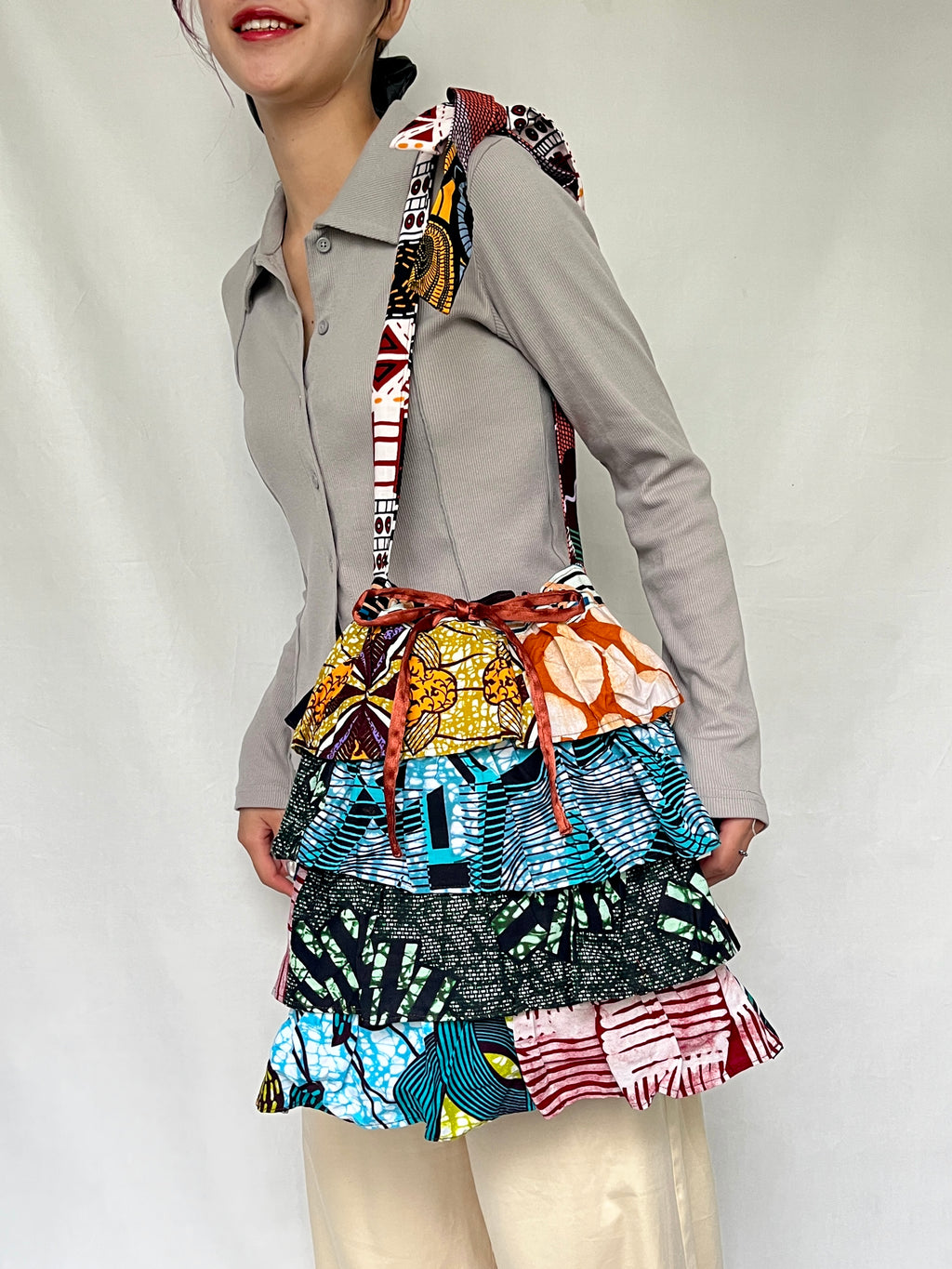 ウガンダ工房にて製品生産で出たハギレを使用しており、どの柄のハギレを使用するかによって、色合いや表情が変わります。その時々にあるハギレで制作しているため、どれひとつとして同じものはなく、ひとつひとつが違う表情を見せる、まさにオリジナルのバッグです。