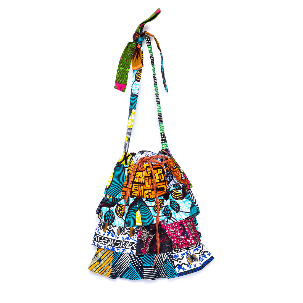 ウガンダ工房にて製品生産で出たハギレを使用しており、どの柄のハギレを使用するかによって、色合いや表情が変わります。その時々にあるハギレで制作しているため、どれひとつとして同じものはなく、ひとつひとつが違う表情を見せる、まさにオリジナルのバッグです。