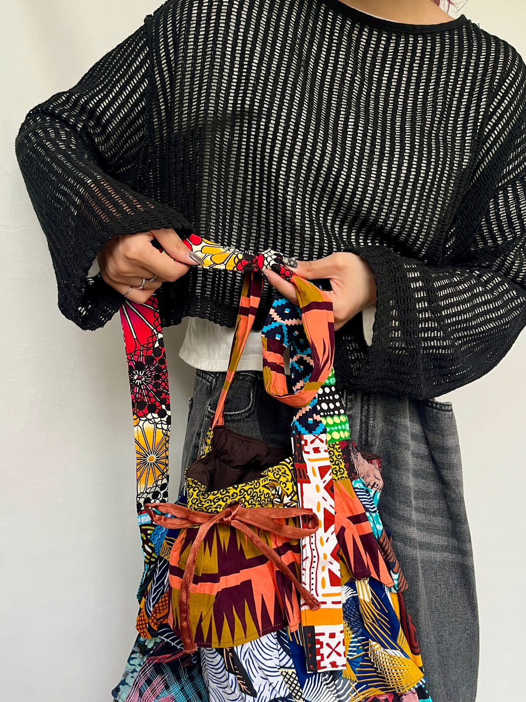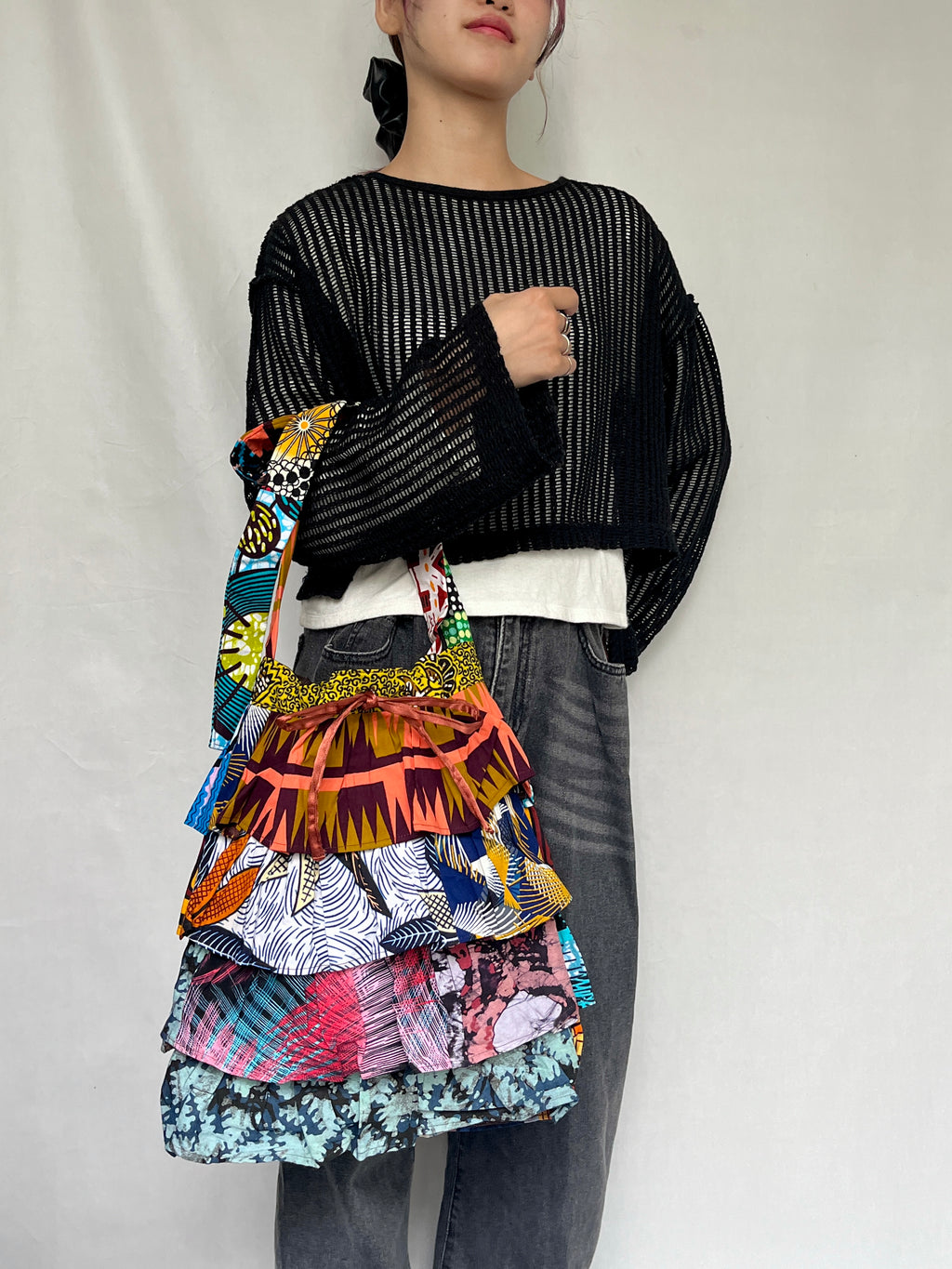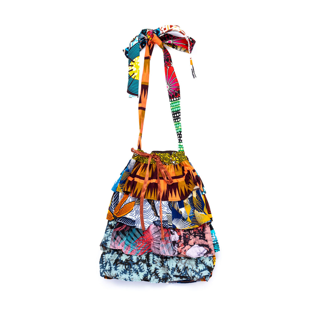 ウガンダ工房にて製品生産で出たハギレを使用しており、どの柄のハギレを使用するかによって、色合いや表情が変わります。その時々にあるハギレで制作しているため、どれひとつとして同じものはなく、ひとつひとつが違う表情を見せる、まさにオリジナルのバッグです。