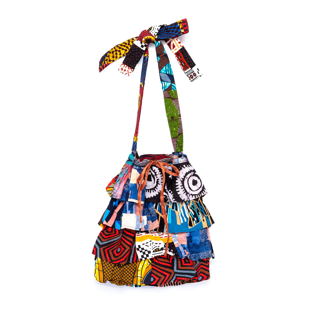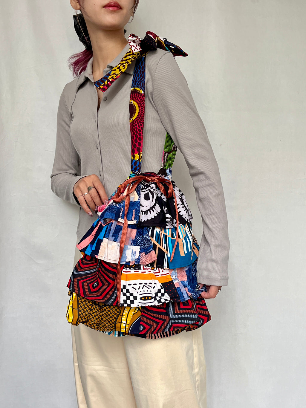 ウガンダ工房にて製品生産で出たハギレを使用しており、どの柄のハギレを使用するかによって、色合いや表情が変わります。その時々にあるハギレで制作しているため、どれひとつとして同じものはなく、ひとつひとつが違う表情を見せる、まさにオリジナルのバッグです。