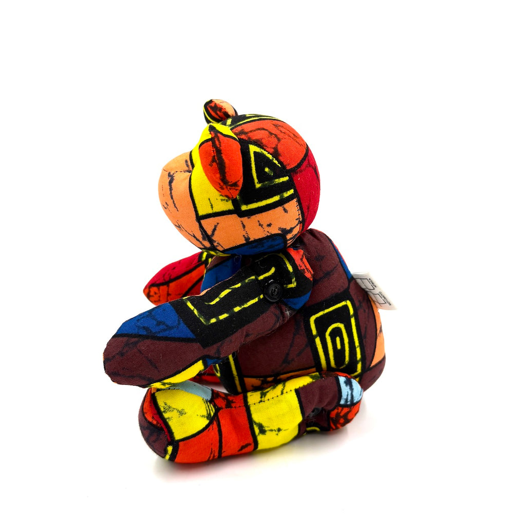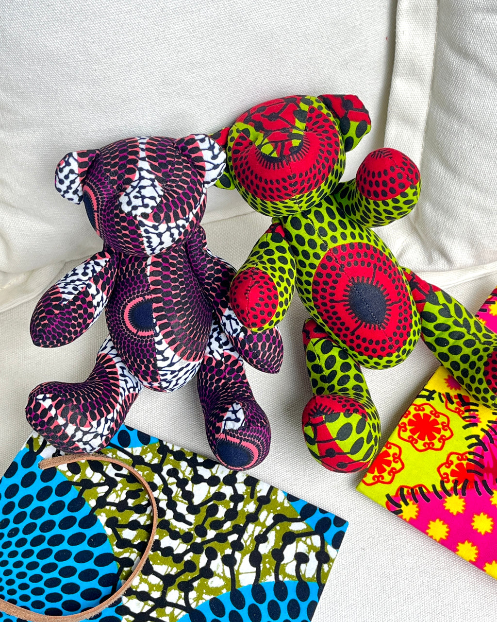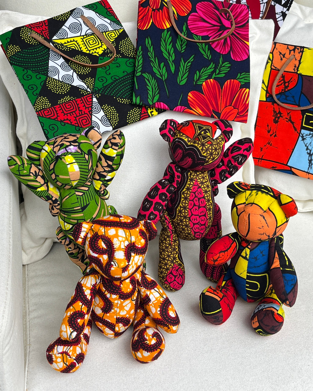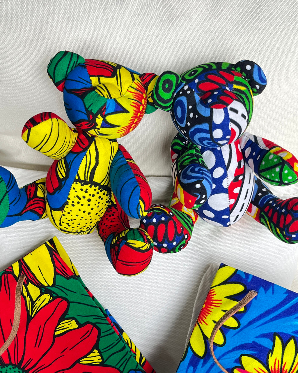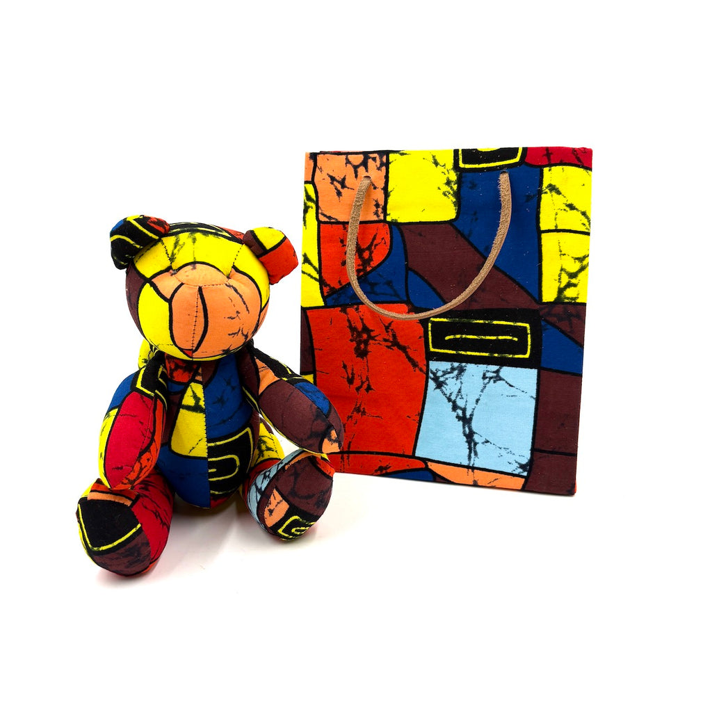 アフリカンプリントでできたテディベアとギフトバッグのセットです。