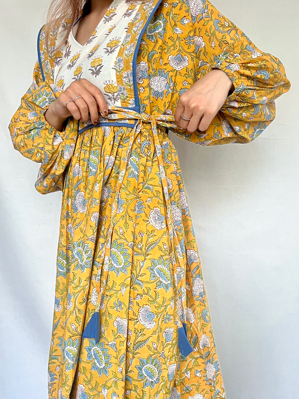キルティングの先には長いリボンがあり、ウェストをキュッとマークすることもできます。