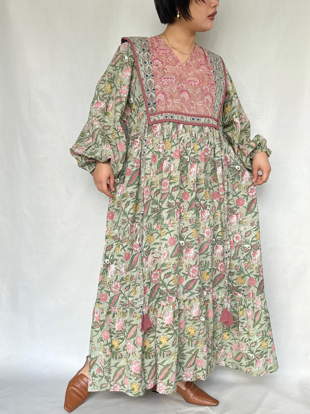 No.38【saruche】キルティングパッチサイドリボンVネックワンピース - モスグリーン -
