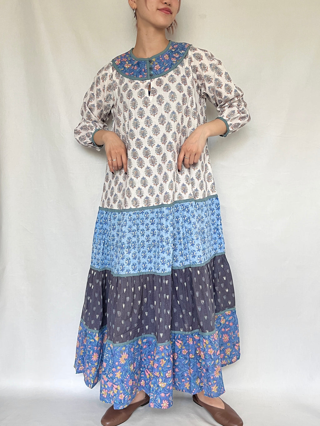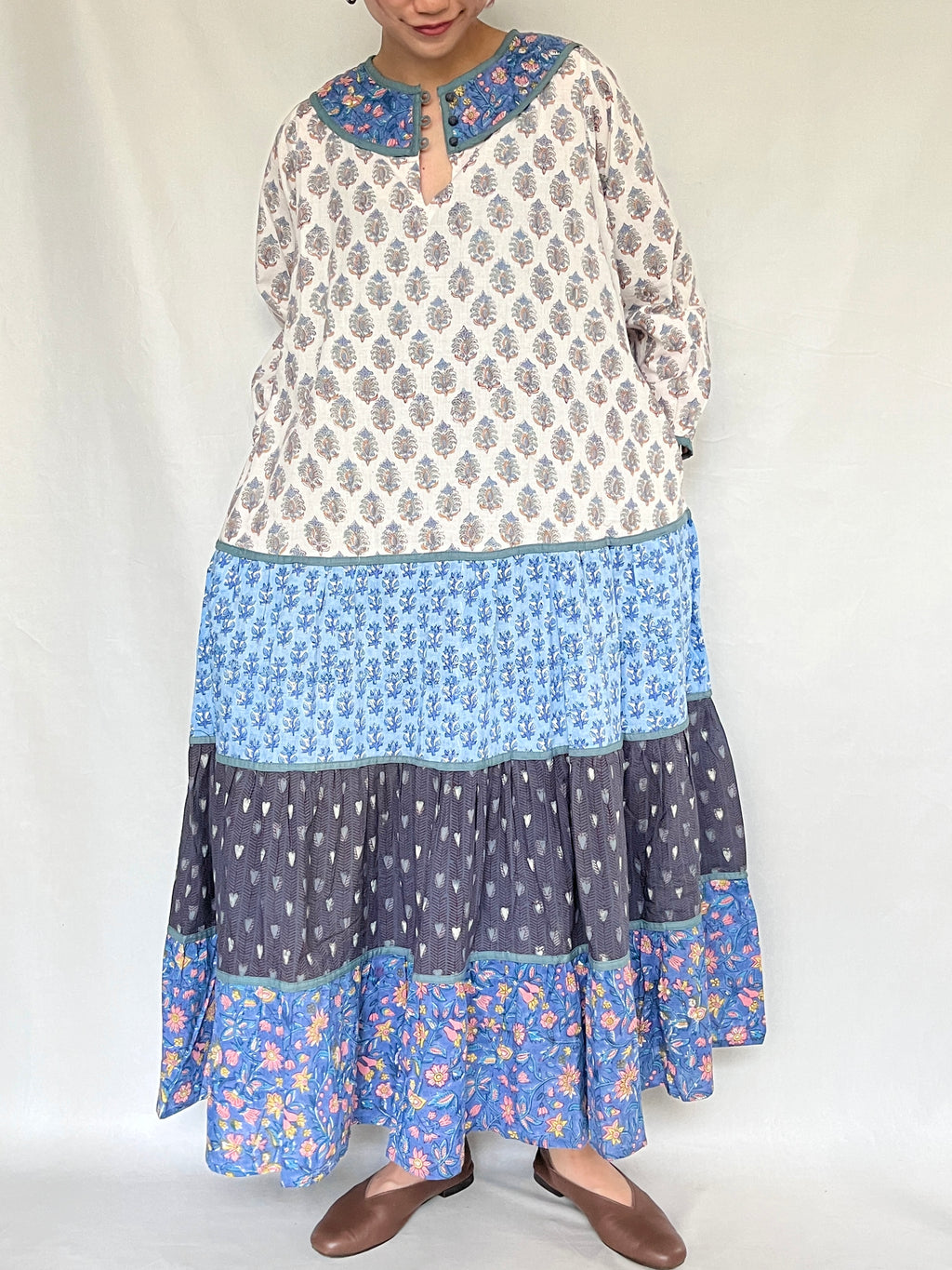 No.35【saruche】3段切り替えラウンドヨークワンピース - ブルー -
