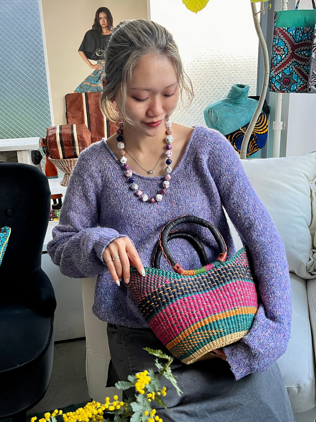 丸くコロンとしたかたちに、バッグの端がキュッととんがっているかたちは、ありそうでなかったバスケットの形です。