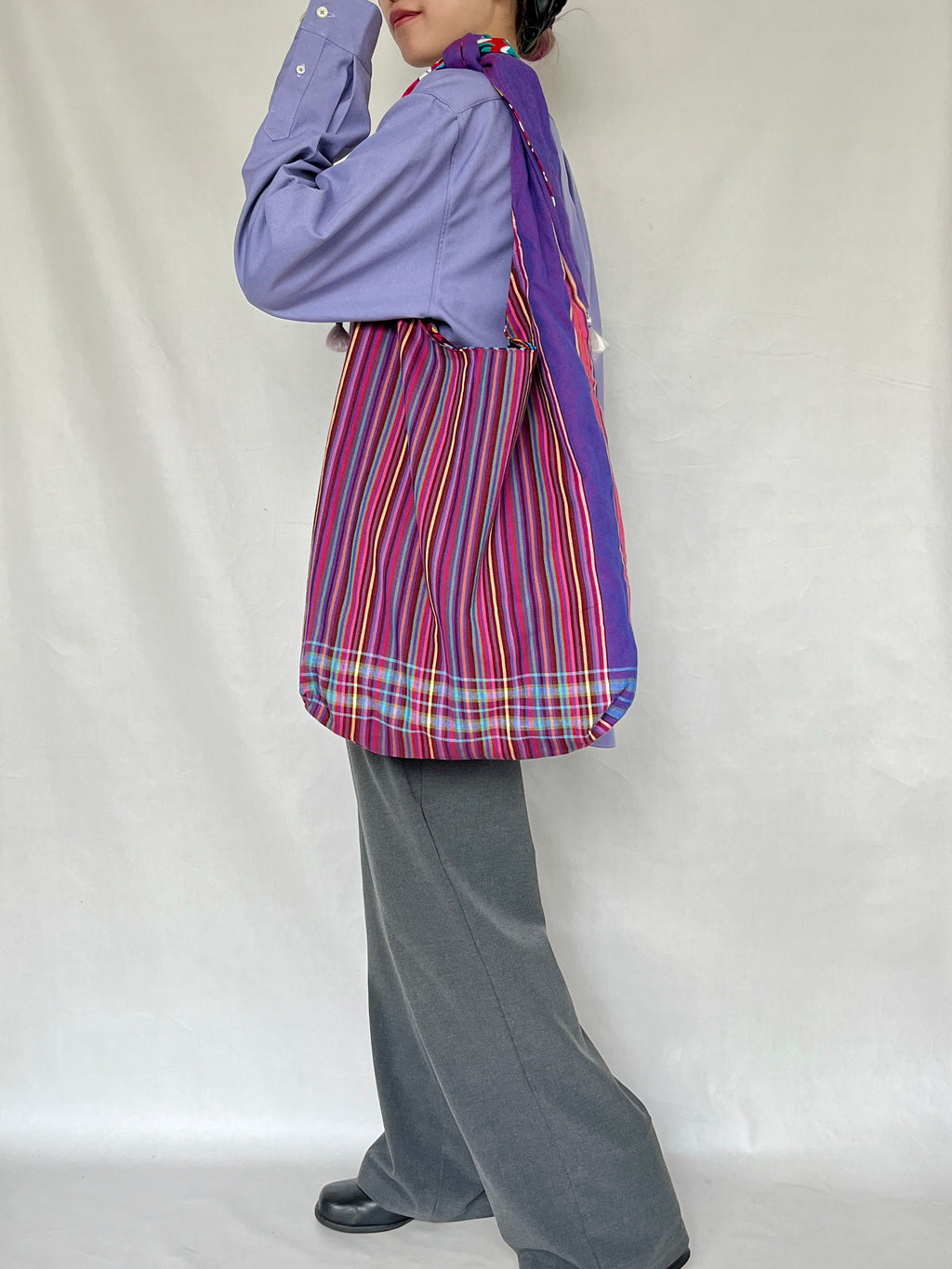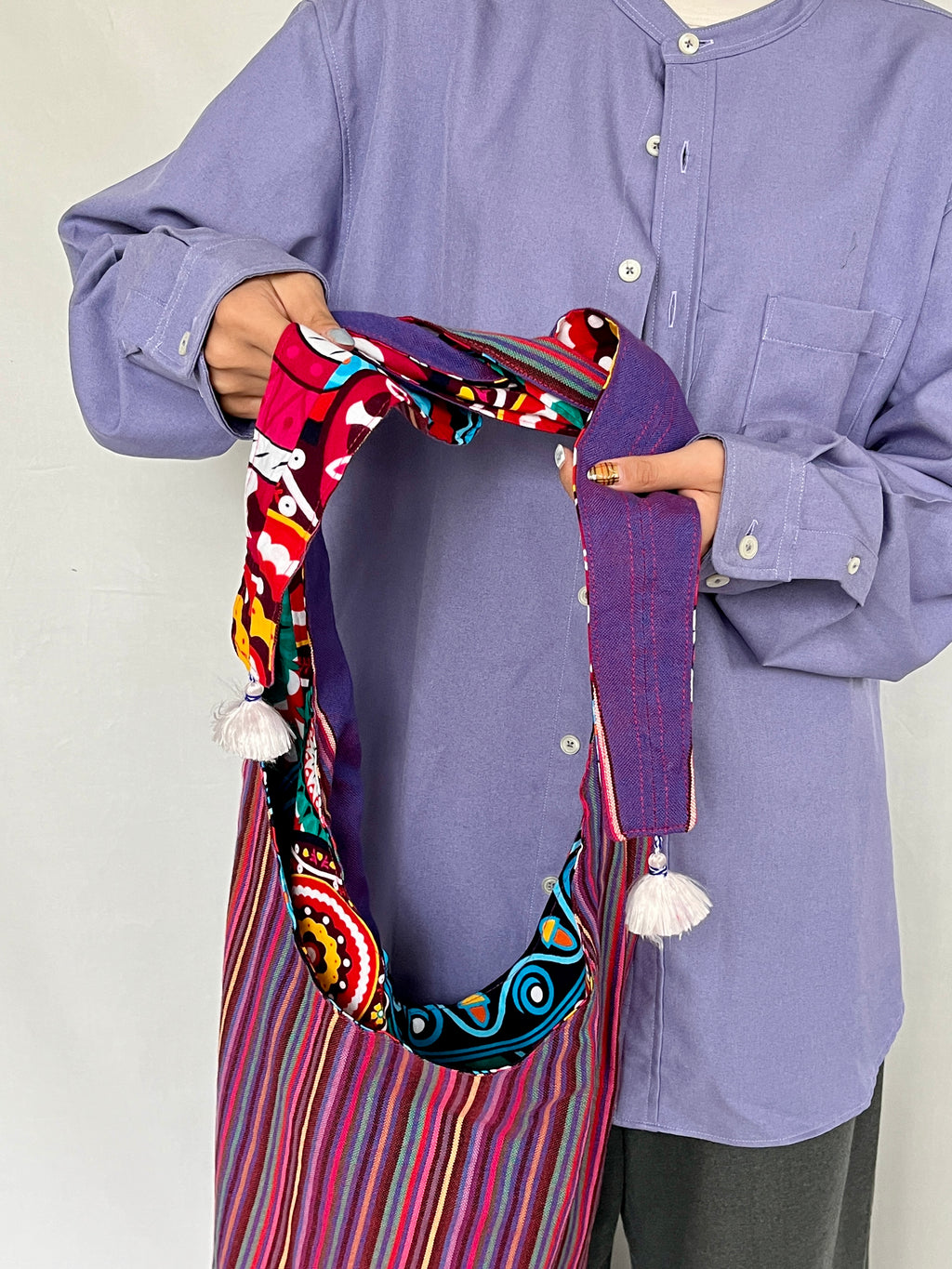 気軽にアフリカンプリントを楽しめる、エコバッグシリーズ。これまでオフホワイトのキコイを使用していましたが、今回はカラフルなストライプ柄のキコイを採用!