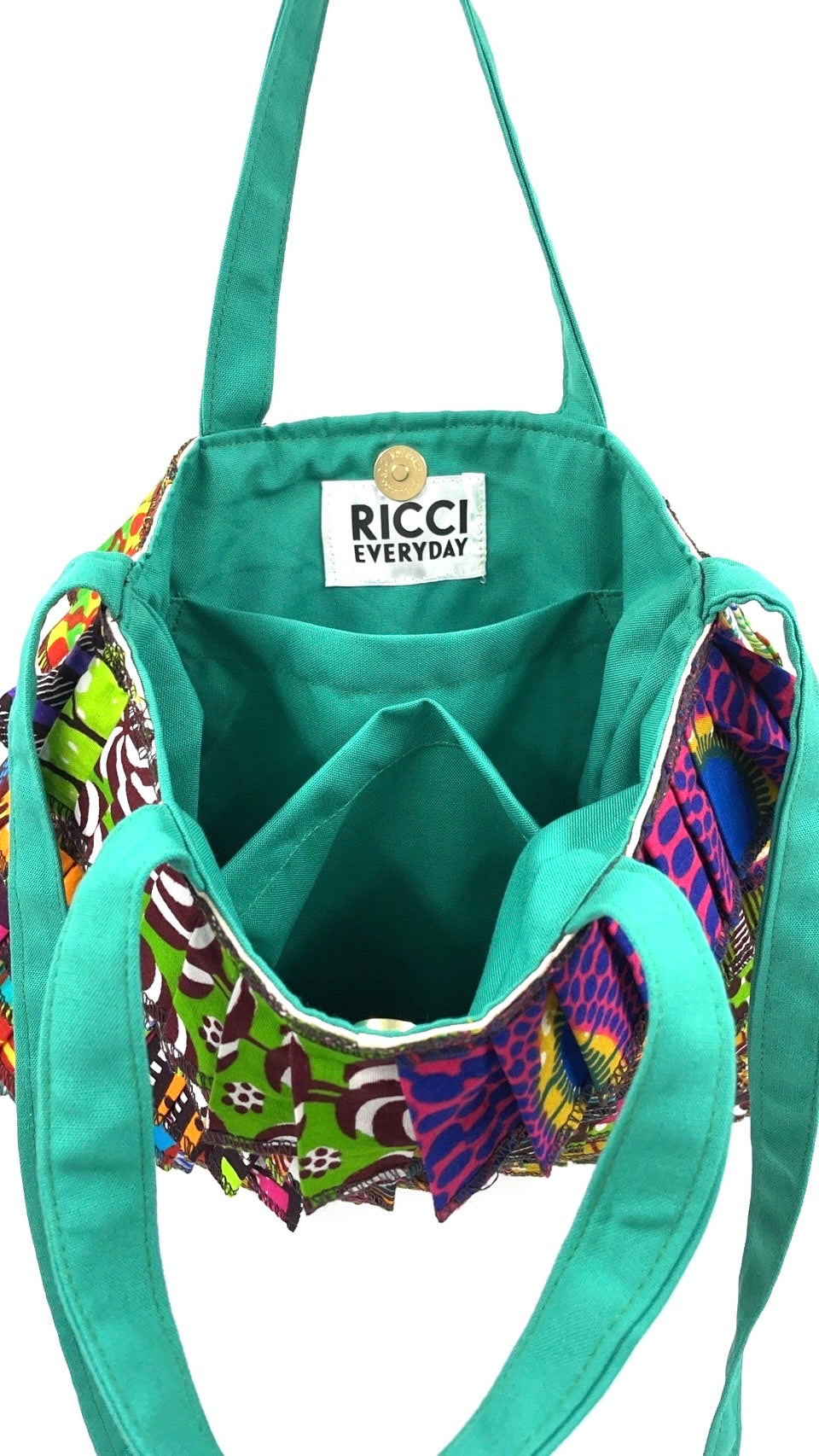 1. RICCI EVERYDAYの製品は、アフリカンワックスプリントの布を使用しています。製品製作時に布に水を通し、色止め加工を施す等、極力、水による色落ちを防ぐようにしております。但し極度な水濡れや摩擦等により色落ちする可能性がありますので、雨の日の使用はお控えいただき、十分にご注意下さい。