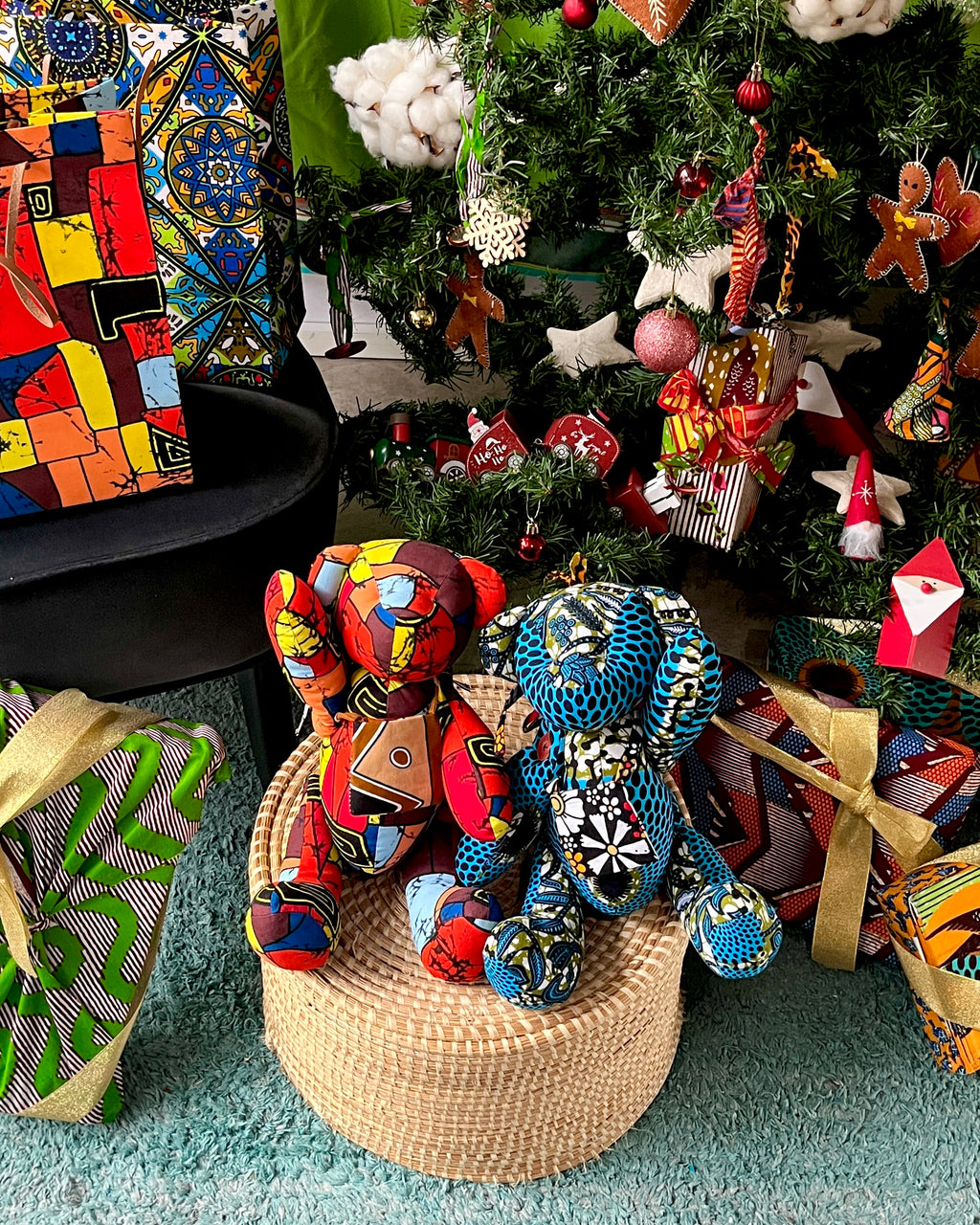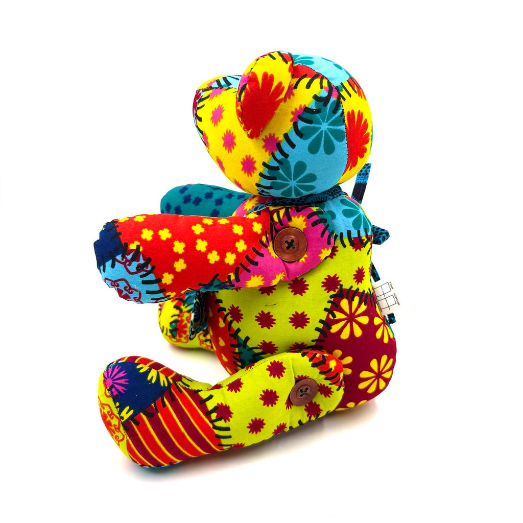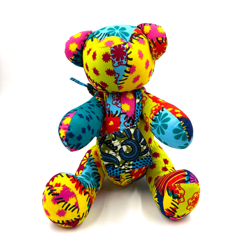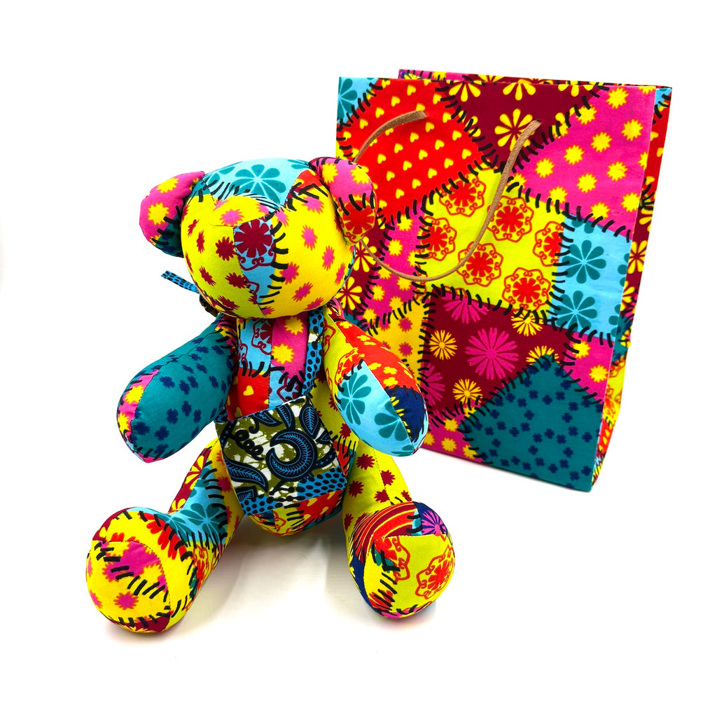 アフリカンプリントでできた大きめのテディベアと、ギフトバッグのセットです。