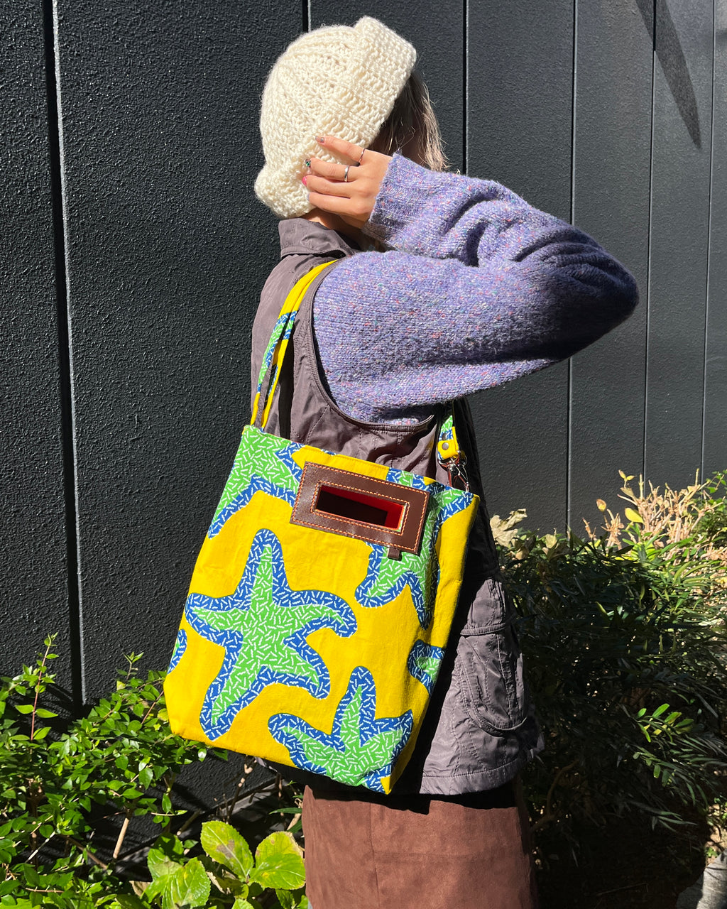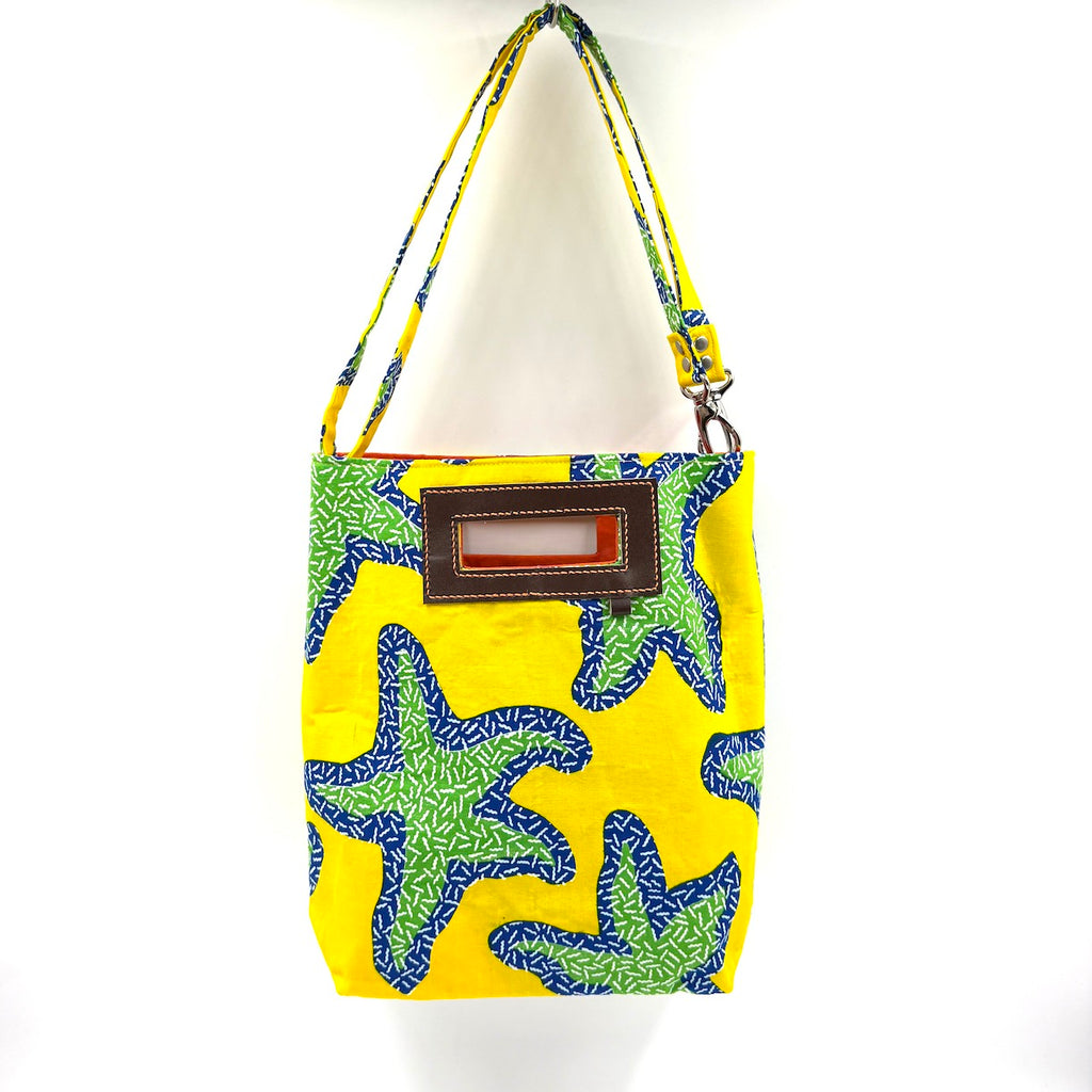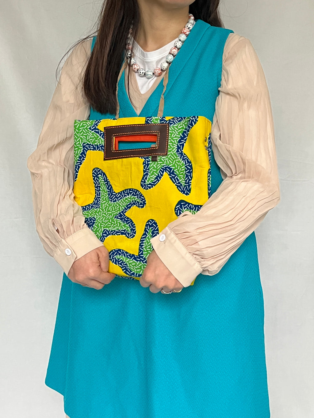 カラフルなアフリカンプリントを使用し、トート・ショルダー・クラッチ・ハンドバッグと4通りで使えます。小さめサイズなので、デイリーユーズのショルダーバッグとしてお使いいただくのもおすすめです。
