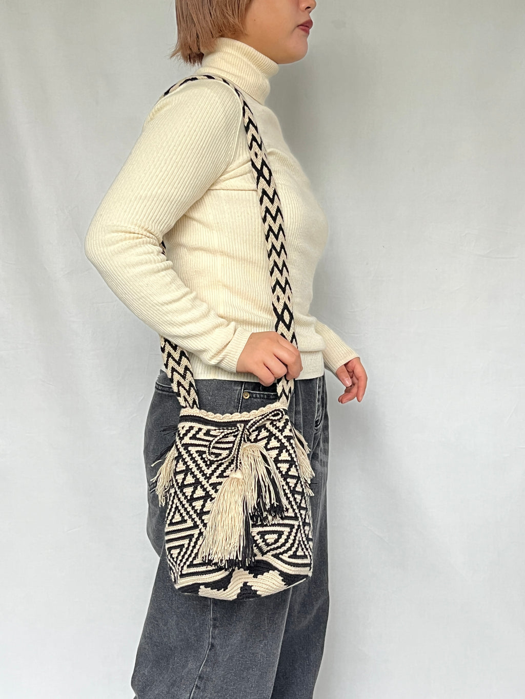 ・2本どり編み(ドス・エブラス)のモチーラの場合、最初は持ち手が短く感じることがございますが、これはものを入れたときに伸びることを想定して作られているためです。使用する際には、使いやすい長さになりますので心配ございません。